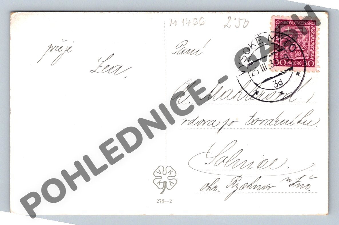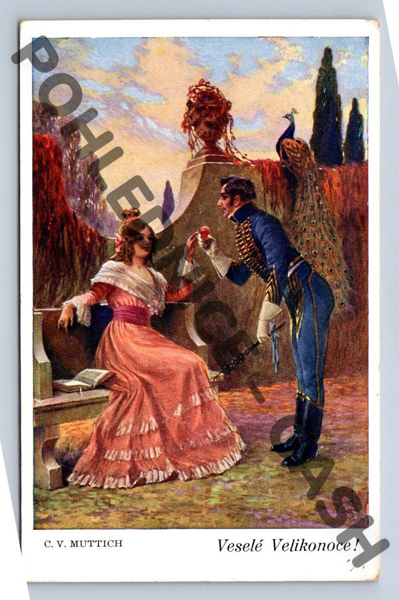 Starší velikonoční pohlednice s krásnou kolorovanou ilustrací od malíře C. V. Mutticha. Na přední straně je vyobrazena scénka s mužem v kroji a ženou v tradičních šatech, doplněná textem Veselé Velikonoce!. Pohlednice byla odeslána (razítko Vysoké Mýto, známka 30 haléřů Československo), na zadní straně ručně psané velikonoční přání. Pohlednice je ve sběratelském stavu, drobné stopy stáří viz foto. Ideální přírůstek do sbírky historických pohlednic nebo tematických velikonočních pohlednic z období první poloviny 20. století.