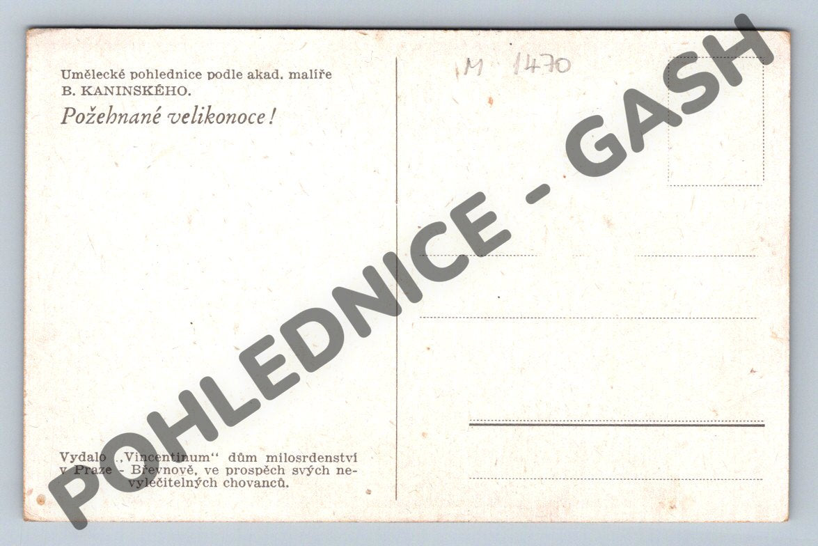 Umělecká pohlednice s náboženským motivem vzkříšení Ježíše Krista, podle ak. malíře B. Kaninského. Na přední straně je barevná malba Krista s vítězným praporem a vojáky svědky této události. Pohlednice nese přání Požehnané velikonoce! a byla vydána domem milosrdenství Vincentinum v Praze – Břevnově, ve prospěch svých nevyléčitelných chovanců. Pohlednice je ve velmi dobrém stavu, bez známek použití. Vhodné pro sběratele, nebo jako dekorace či dárek s velikonoční tematikou.