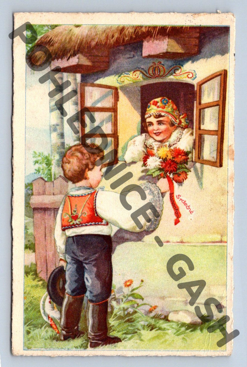 Originální stará pohlednice z období první poloviny 20. století. Pohlednice je barevná, s motivem krojovaných dětí, kdy chlapec předává květiny dívce v kroji u okna vesnického stavení. Stylizace je typická pro českou vesnici, pohlednice byla určena k velikonočním svátkům. Na zadní straně poštovní razítko a známka Československo, rukou psaný pozdrav, adresovaná slečně Jirouškové do Prahy. Pohlednice nese známky stáří – drobné ohyby, lehké nečistoty a otěry, což je patrné na fotografii. Velmi pěkný sběratelský kousek v původním stavu.