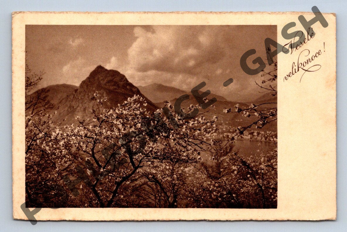 Originální velikonoční pohlednice z období první poloviny 20. století, vytištěná v Československu. Pohlednice zachycuje jarní krajinu s rozkvetlými stromy a horami v pozadí, v decentním sepiovém tónu. V pravém horním rohu je český nápis Veselé velikonoce! . Pohlednice je dosud nepopsaná ani neprošlá poštou, na zadní straně nese označení Printed in Czechoslovakia a výrobní číslo. Ideální pro sběratele starých pohlednic, zájemce o českou krajinu či milovníky historických velikonočních přání.