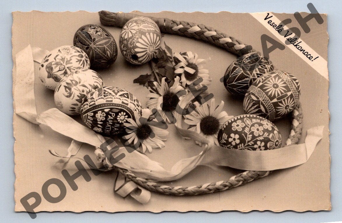 Originální velikonoční pohlednice s tradičními ručně zdobenými kraslicemi a pletenou pomlázkou, doplněná květy a stuhou. V levém horním rohu je nápis Veselé Velikonoce!. Pohlednice je černobílá, má lehce vlnité okraje a zadní strana je označena jako Pravá fotografie. Pochází pravděpodobně z první poloviny 20. století. Ideální sběratelský kousek pro milovníky českých tradic a folkloru.