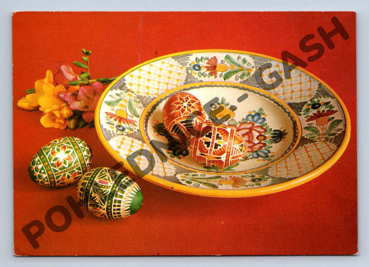Originální velikonoční pohlednice z bývalého Československa, odeslaná v době socialismu. Na lícové straně je vyobrazena tradiční malovaná keramická mísa s pestrobarevnými kraslicemi a květinami, motiv je laděn do sytých barev. Rubová strana obsahuje ručně psané velikonoční přání, známku a poštovní razítko. Pohlednice je v dobrém stavu se známkami běžného opotřebení odpovídajícího stáří. Vhodné pro sběratele velikonočních či etnografických pohlednic, případně jako ukázka tradičních českých svátků a výtvarného zpracování lidových motivů.