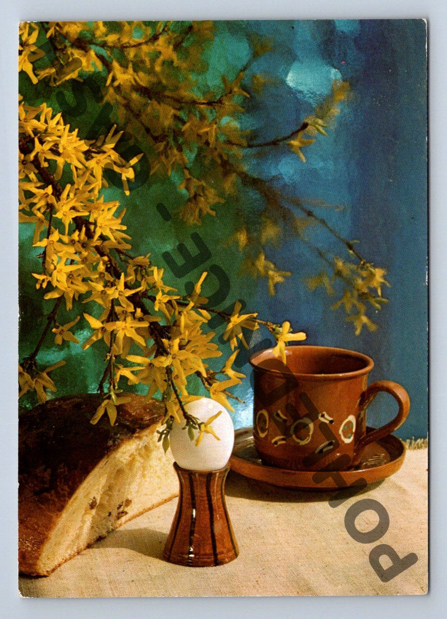 Velikonoční pohlednice z období Československa s typickým etnografickým motivem - zátiší s keramickým hrníčkem, vázou s jarními větvičkami, bílým vajíčkem a krajícem chleba na tradičním ubruse. Pohlednice je použita, zapsaná s velikonočním pozdravem a vybavena známkou s folklorním motivem. Vhodná sběratelům pohlednic s tematikou českých zvyků, tradic a venkovského života. Datum odeslání a známka dodávají kouzlo starých časů.