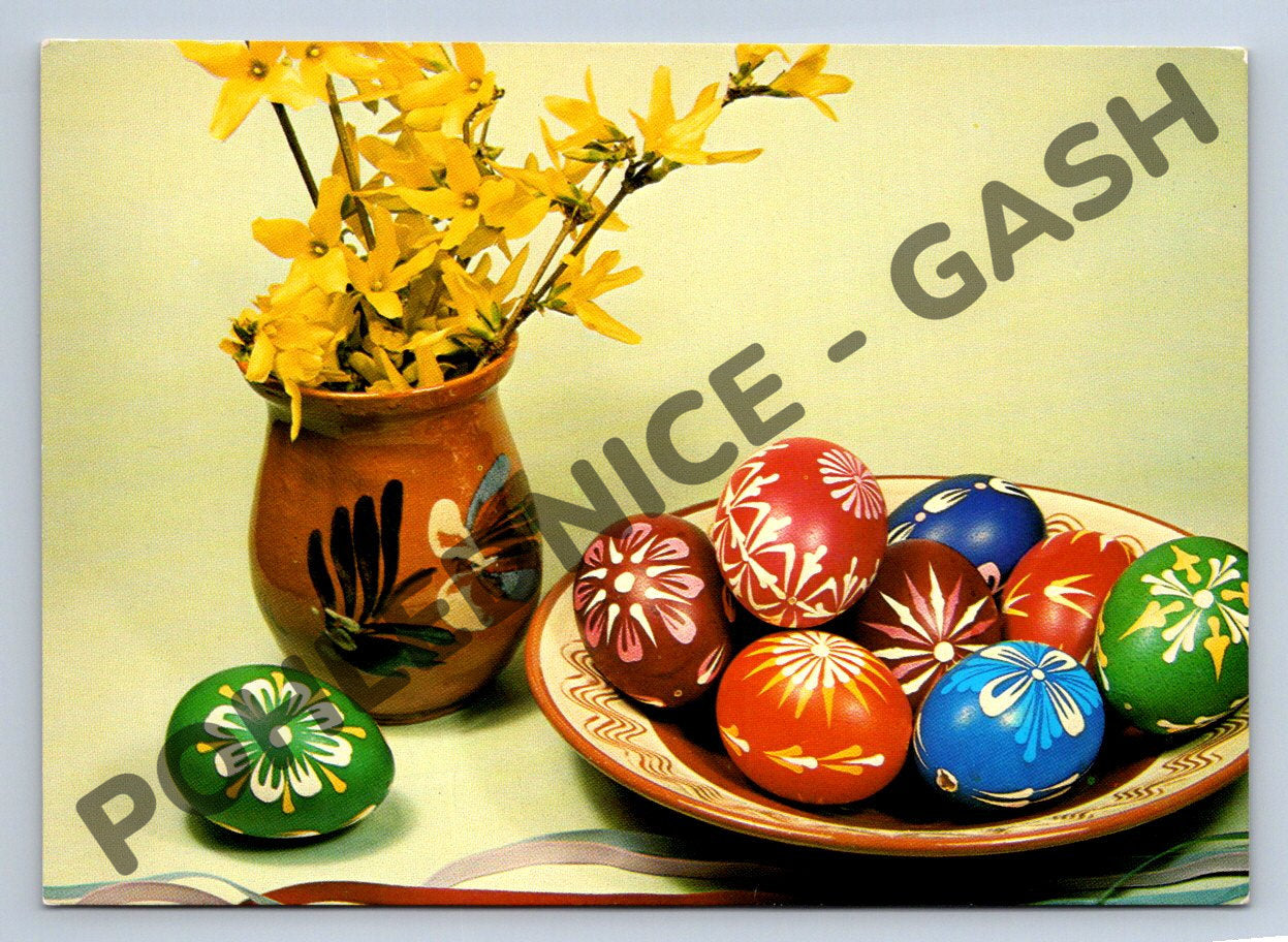 Velikonoční pohlednice s tradičním motivem zdobených kraslic v misce a květin ve váze. Barevná fotografie zachycuje typické folklórní zdobení kraslic různých barev, které jsou součástí velikonočních tradic na Slovensku a v Česku. Fotografie: Svatoslav Polak. Jedná se o pohlednici z nakladatelství PRAVDA, Bratislava. Pohlednice není použitá, ve velmi dobrém stavu, vhodná do sbírky tradičních a etnografických motivů.