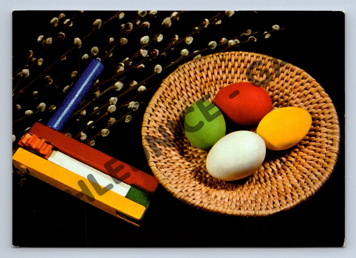 Velikonoční pohlednice s motivem tradičních barevných kraslic v proutěném košíku, obklopená pomlázkami a řehtačkou. Pohlednice je s textem Radostné velikonoce a typickými symboly českých Velikonoc. Tisk Severografia Děčín, foto Vladimír Soukup. Ve velmi dobrém stavu, čistá, bez zápisu. Vhodná pro sběratele historických velikonočních pohlednic nebo jako dekorace.