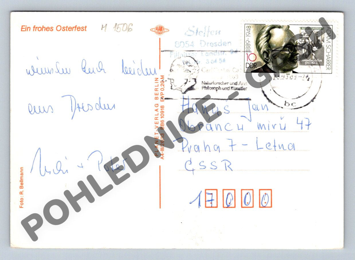 Velikonoční pohlednice zaslaná z NDR (Německá demokratická republika) do Československa. Na přední straně je fotografie košíku s velikonočními dekoracemi – vajíčky a zajíčky vyrobenými z vajec nebo modelíny, obklopených jarními květy. Zadní strana obsahuje známku, razítko a ručně psaný vzkaz v němčině z města Drážďany. Pohlednice je datována, opatřena známkou s motivem Adama Scharrera, německého spisovatele. Hezký sběratelský kousek s tematikou Velikonoc a připomínkou dobové korespondence mezi státy bývalého východního bloku. Stav dle skenu, nepopsaná sběratelsky cenná razítka i známka.