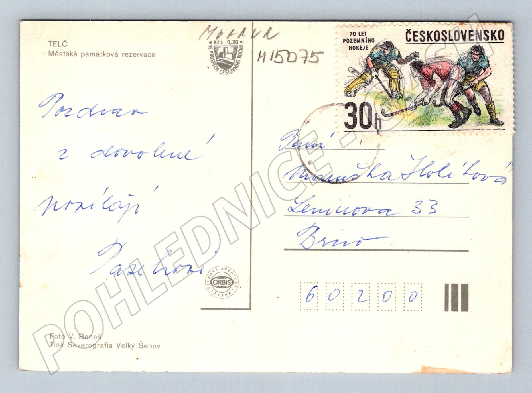 Originální pohlednice města Telč, historické městské památkové rezervace zapsané na Seznamu světového kulturního dědictví UNESCO. Pohlednice zachycuje známá panoramata malebného historického centra a typická podloubí telčských domů. Na zadní straně původní poštovní známka (70 let pozemního hokeje, 30 h, Československo) a ručně psaný vzkaz z období ČSSR. Vhodné pro sběratele historických pohlednic, zájemce o architekturu i milovníky Českého dědictví. Stav odpovídá stáří, viz foto.