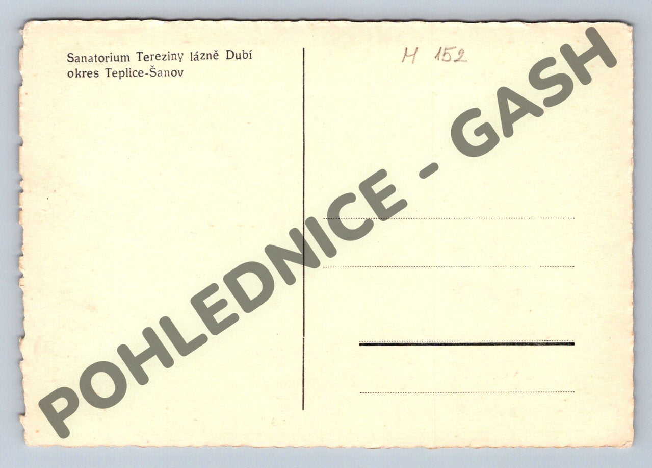 Originální černobílá pohlednice zobrazující Sanatorium Tereziny lázně v Dubí, okres Teplice-Šanov. Na fotografii je zachycen hlavní lázeňský objekt s krásně upravenou zahradou a parkovou úpravou před budovou. Pohlednice má zoubkované okraje a odpovídá malému historickému formátu typickému pro období první poloviny 20. století. Zadní strana je nepopsaná, v levém horním rohu je uveden název místa a lokalita. Velmi pěkný sběratelský stav, ideální do kolekce pohlednic z lázeňských měst a severních Čech.