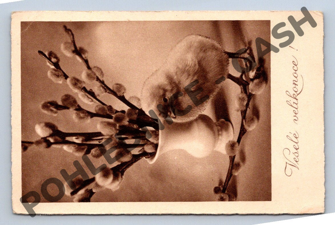 Starší velikonoční pohlednice s fotografií kuřátka na větvičce s jehnědami. Pohlednice nese český nápis Veselé velikonoce! a je ve velmi pěkném sběratelském stavu, bez známky a rukopisu. Rozměr pohlednice je klasický, na zadní straně je vyznačeno místo pro známku a text. Ideální jako doplněk sbírky starých velikonočních pohlednic nebo jako dekorace.