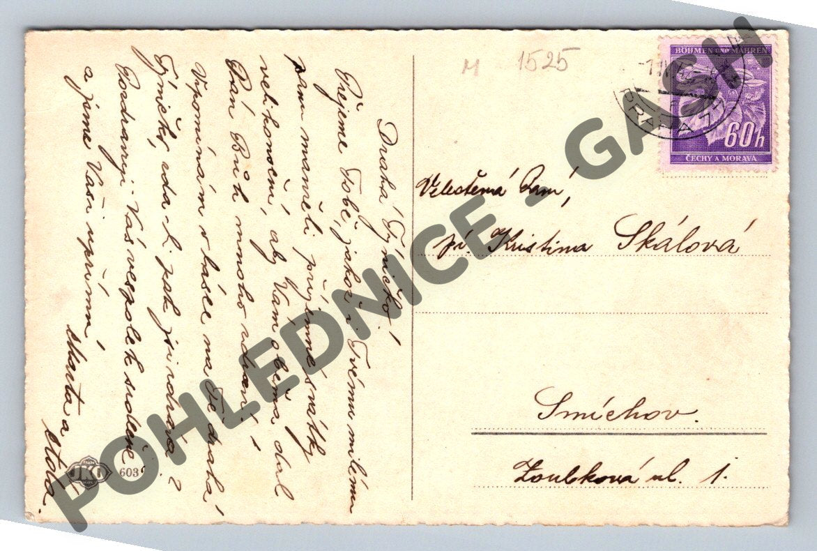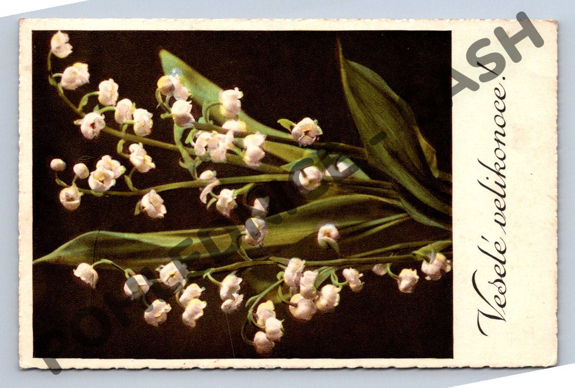 Originální stará velikonoční pohlednice z období Protektorátu Čechy a Morava. Na lícové straně je fotografie konvalinek a nápis Veselé velikonoce! . Pohlednice byla zaslána poštou, je opatřena známkou Čechy a Morava s hodnotou 60h a razítkem Praha. Na zadní straně je ručně psaný text a adresa odeslání do Smíchova. Pohlednice nese běžné známky stáří a opotřebení, rohy mohou být mírně ohnuté. Velmi pěkný sběratelský kousek s tematickým motivem a původní poštovní známkou z období druhé světové války.