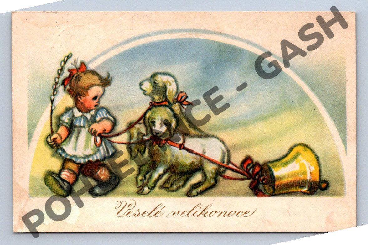 Nabízím originální velikonoční pohlednici z období do roku 1950. Na přední straně je vyobrazena roztomilá scéna s děvčátkem, jehňátkem a velikonočním zvonkem, vše v jemných pastelových barvách a s nápisem Veselé Velikonoce. Pohlednice je ručně psaná a prošlá poštou. Stav pohlednice odpovídá stáří – drobné stopy opotřebení, místy mírné skvrny a ohyby, viz foto. Zadní stranu zdobí dobový rukopis a adresa příjemce. Skvělý sběratelský kousek pro milovníky historických velikonočních pohlednic a české nostalgie.
