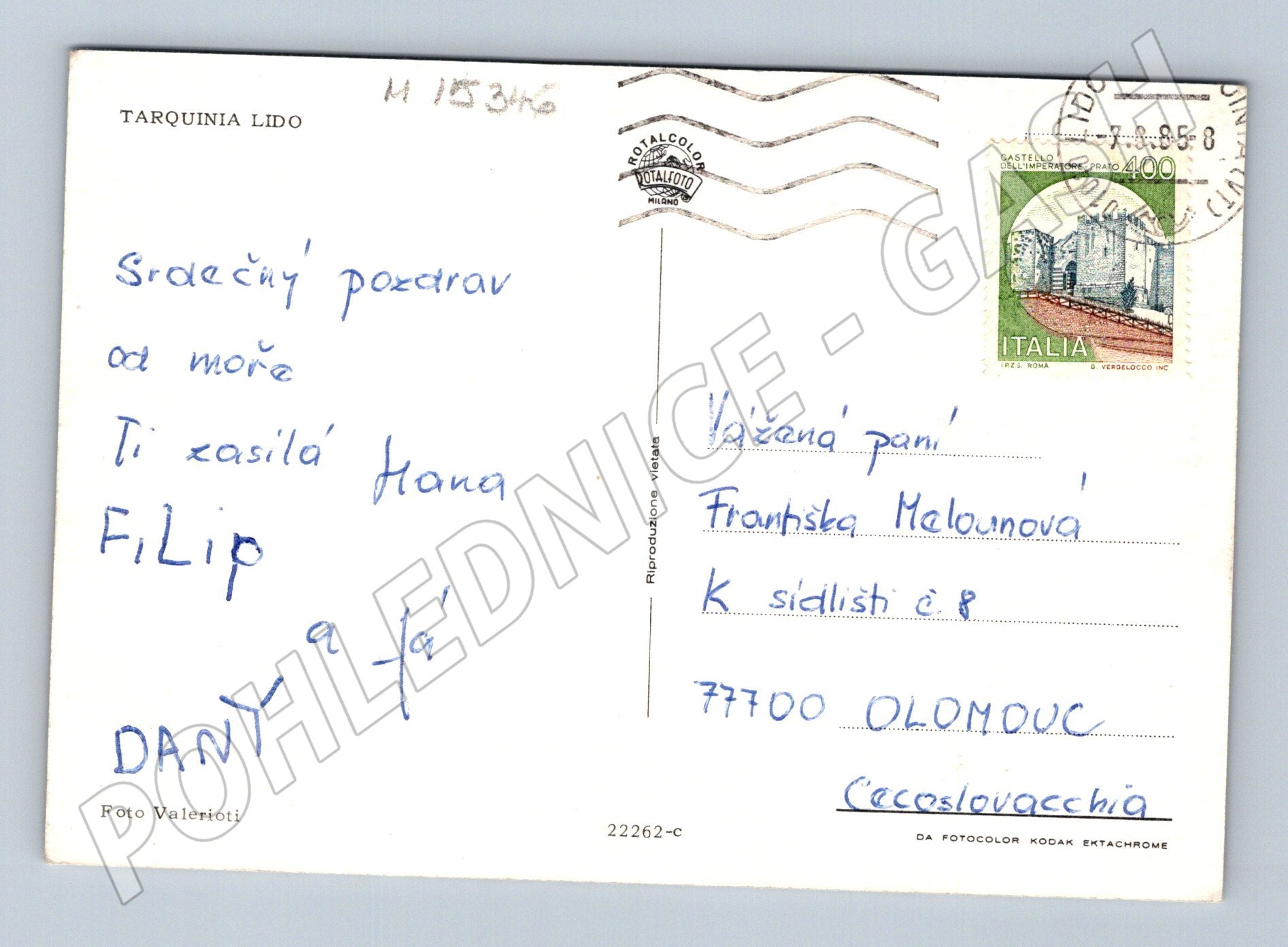 Originální pohlednice z Itálie s motivem letoviska Tarquinia Lido. Na přední straně je barevná fotografie pláže s množstvím slunečníků, koupajících se lidí a přilehlé silnice s automobily, což vystihuje atmosféru italského letoviska v 80. letech. Na zadní straně je ručně psaný pozdrav v češtině zaslaný do Olomouce, včetně italské známky a poštovního razítka z roku 1988. Pohlednice je vhodná do sbírky pro milovníky Itálie, cestování či historických pohlednic. Stav odpovídá stáří – pohlednice je použita, poštovně prošlá a v dobrém stavu.