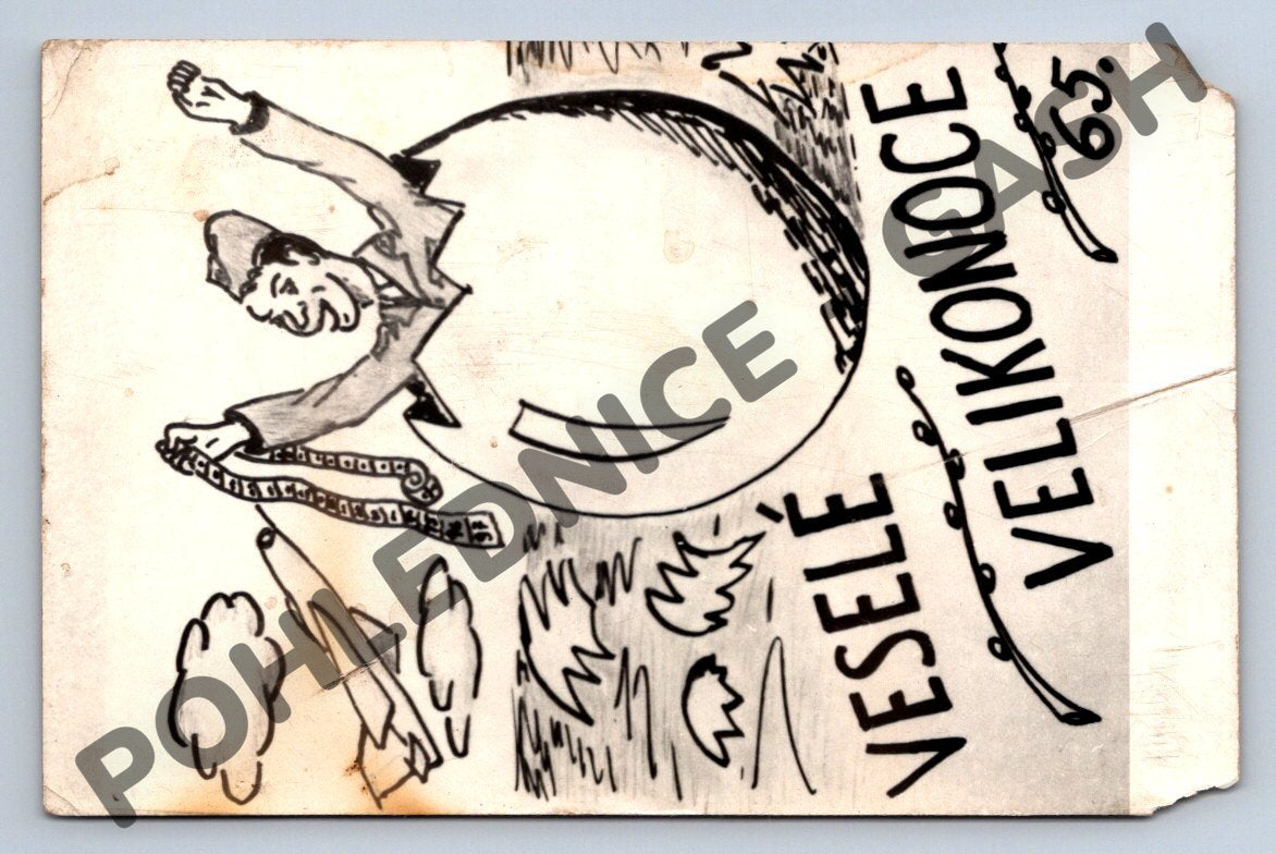 Originální velikonoční pohlednice s ručně kresleným motivem, datovaná rokem 1965. Na pohlednici je neobvyklý obrázek muže s pomlázkou a tradičním velikonočním přáním Veselé Velikonoce. Na druhé straně je ručně psané věnování paní Klüglerové do Duchcova a poštovní známka ČSSR v hodnotě 30 h. Pohlednice nese známky používání a stáří – rohy jsou mírně ohnuté, je patrné opotřebení, skvrny a drobné poškození. Skvělý sběratelský kousek s dobovou atmosférou a osobním kouzlem.