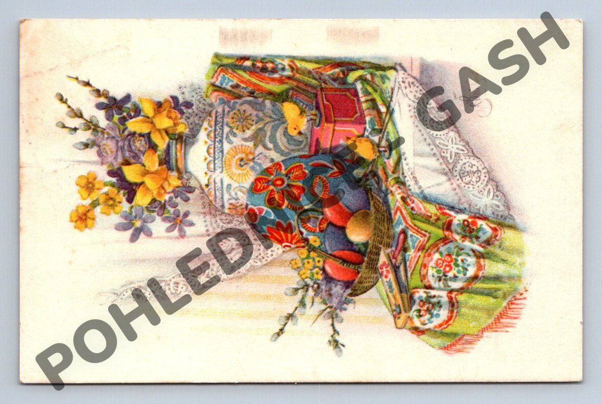 Starobylá velikonoční pohlednice z období Československa, odeslaná s poštovní známkou a ručně psaným textem. Na přední straně je krásná barevná ilustrace tradičních velikonočních motivů – vyšívaný ubrus, kraslice a květiny, laděné v etnografickém stylu. Zadní strana obsahuje osobní vzkaz a adresu adresáta v Praze, s původní známkou 50 haléřů s portrétem T. G. Masaryka. Pohlednice je ve velmi dobrém sběratelském stavu, drobné známky stáří odpovídající době vzniku. Výjimečný předmět pro milovníky historie, velikonočních tradic a české etnografie.