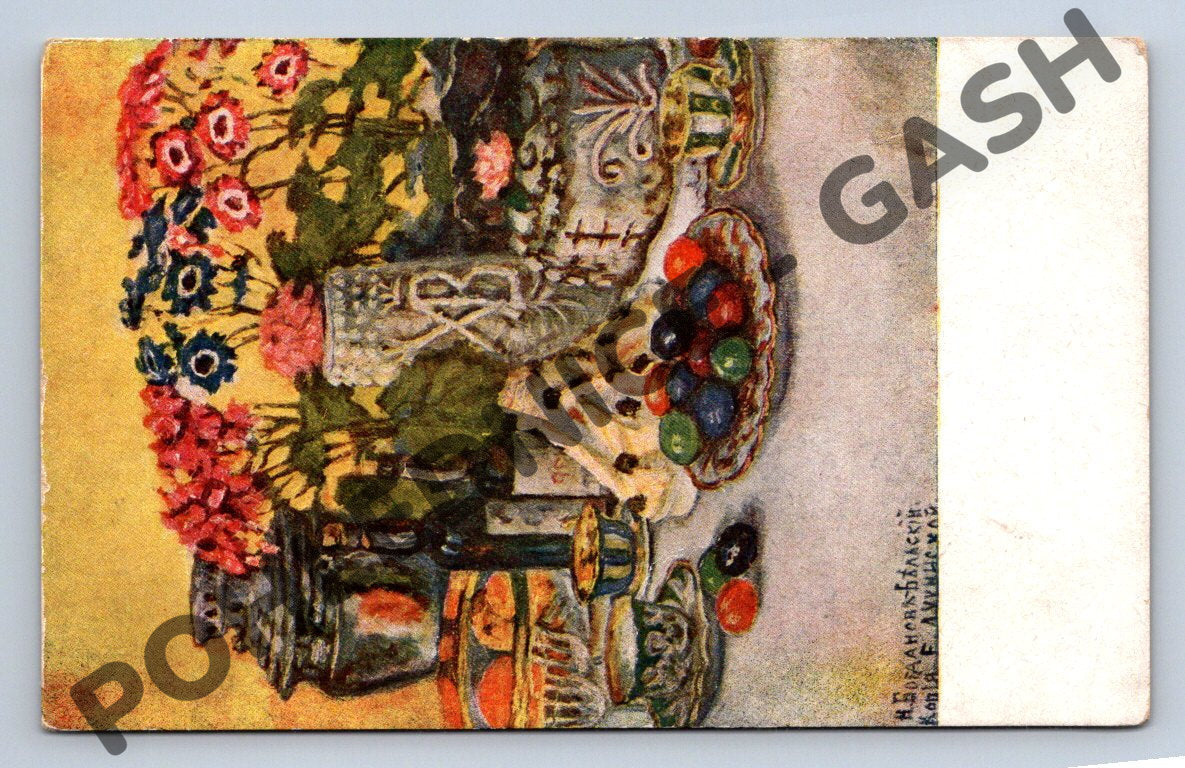 Nabízím originální pohlednici s názvem Velikonoční stůl od významného malíře N. Bogdanov-Bělský. Pohlednice zachycuje malířskou reprodukci zátiší s velikonočním motivem – bohatě prostřený stůl s barevnými kraslicemi, květinami a tradičními dekoracemi ve výrazných barvách. Pohlednice je neprošlá poštou, ve velmi dobrém sběratelském stavu, s minimálním opotřebením odpovídajícím stáří. Ideální přírůstek do sbírky tematických nebo malovaných pohlednic s uměleckou hodnotou.