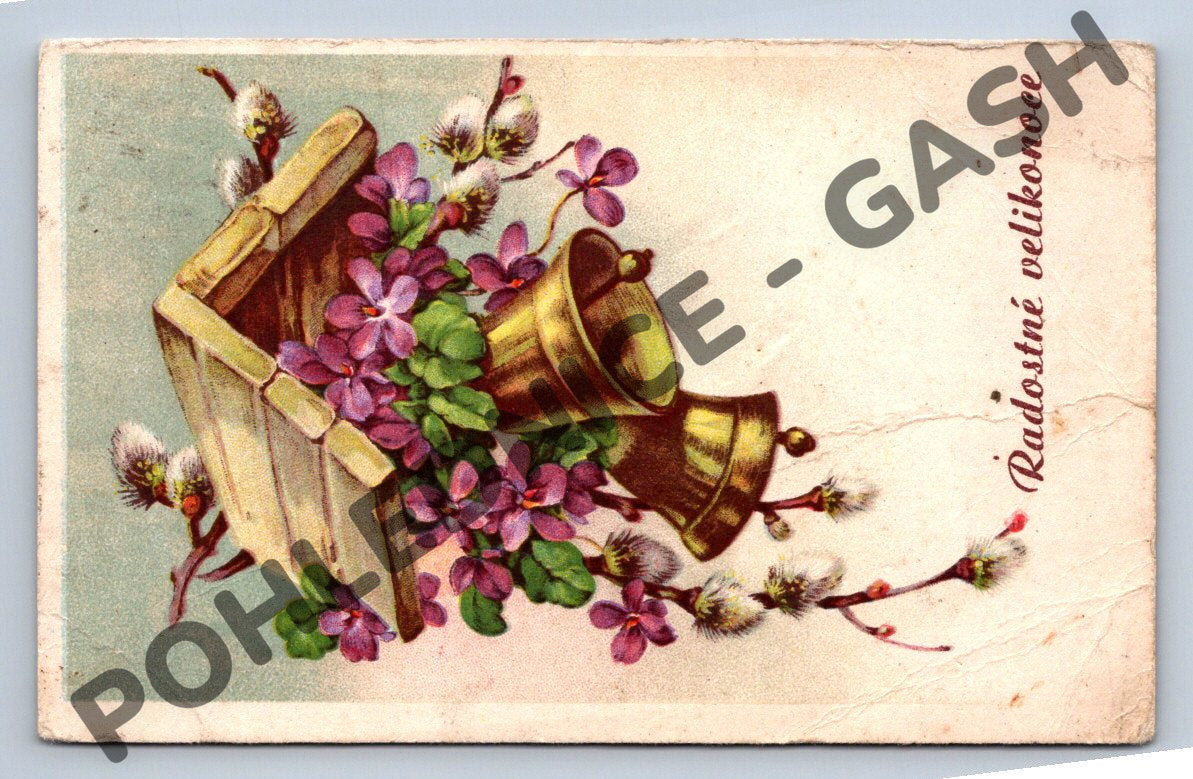 Starobylá velikonoční pohlednice s motivem jarních květin (fialky, kočičky), zvonku a dřevěného plotu. Text na přední straně: Radostné velikonoce. Pohlednice je psaná a prošlá poštou, celkově ve velmi pěkném stavu s drobnými známkami stáří, viz foto. Zadní strana obsahuje rukopisné přání adresované slečně Emilce. Vhodné do sbírky, jako dekorace, nebo jako dárek pro sběratele historických velikonočních pohlednic.