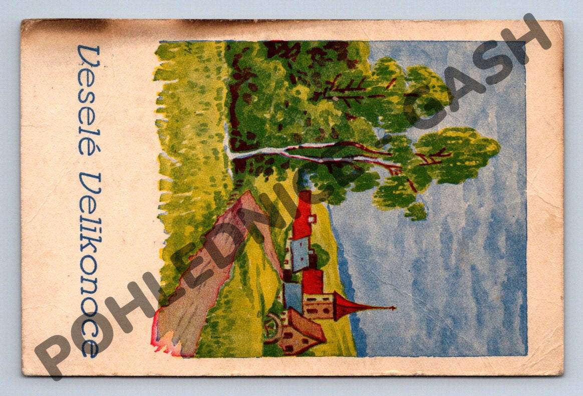Starší velikonoční pohlednice s motivem malované krajiny a vesnické scenérie. Na lícové straně je nápis Veselé Velikonoce. Pohlednice byla odeslána, na zadní straně se nachází rukopisné věnování a známka s portrétem československého prezidenta. Pohlednice nese typické známky stáří (patina, mírné opotřebení rohů). Skvělý sběratelský kousek i dekorativní předmět pro milovníky starých pohlednic a velikonočních motivů.