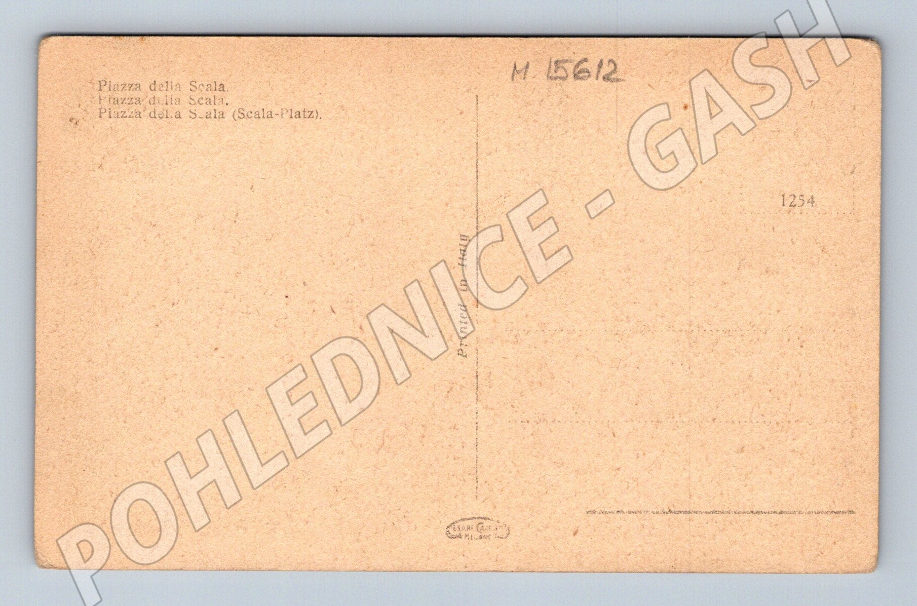 Originální historická pohlednice zobrazující slavné náměstí Piazza della Scala v Miláně, Itálie. Na přední straně je pohled na ikonickou budovu opery La Scala a okolní architekturu. Dobová atmosféra je zvýrazněná zaparkovanými historickými automobily a postavami lidí pohybujících se po náměstí. Pohlednice je ve velmi dobrém sběratelském stavu, bez psaní či poškození, nese označení Printed in Italy . Krásný sběratelský kousek zachycující atmosféru Milána ve 20.–30. letech 20. století.