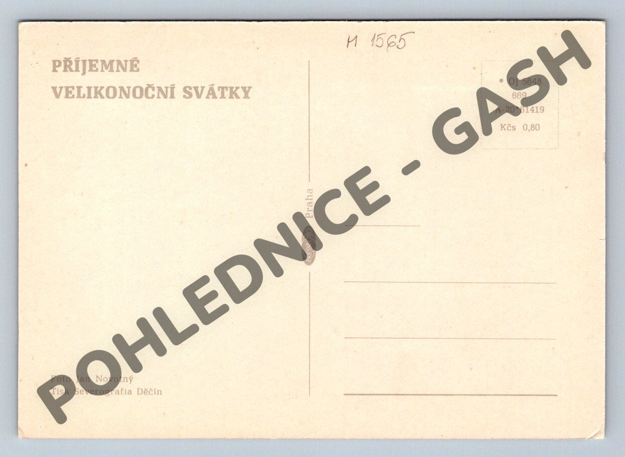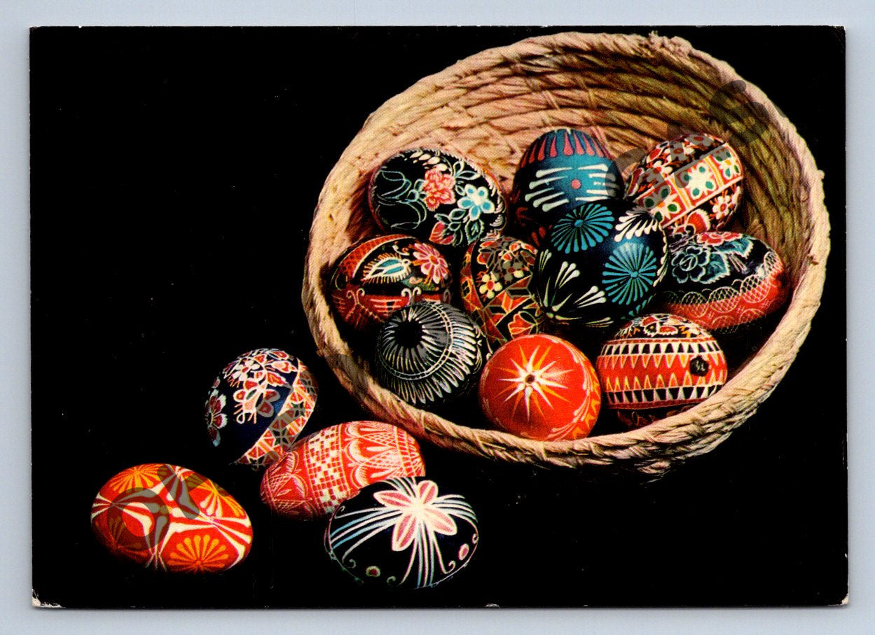 Velikonoční pohlednice zobrazující tradiční ručně malovaná kraslice v proutěném košíku. Pohlednice je s přáním Příjemné velikonoční svátky a pochází z Československa, foto Jan Novotný, tisk Severografia Děčín. Jedná se o ukázku lidového umění a českých velikonočních tradic. Ideální pro sběratele etnografických pohlednic nebo milovníky velikonočních zvyků. Pohlednice je neprošlá poštou, ve velmi dobrém stavu.
