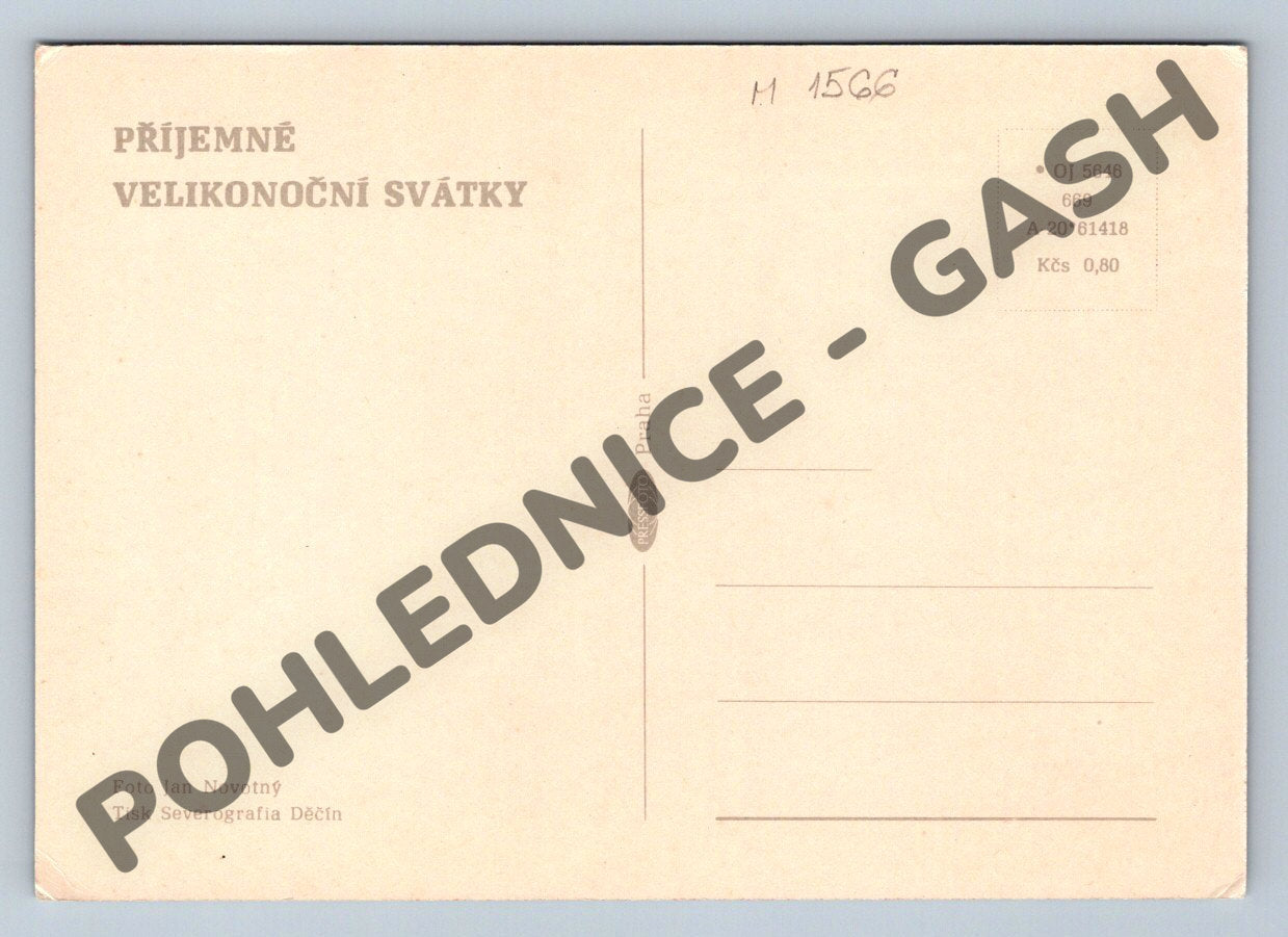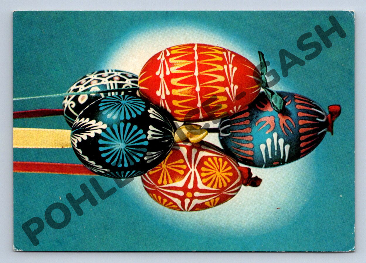 Velikonoční pohlednice z ČR, ilustrovaná tradičními ručně malovanými kraslicemi. Na přední straně je vyobrazeno několik barevných vajíček ozdobených lidovými motivy a stuhami na modrém pozadí. Na zadní straně je nápis PŘÍJEMNÉ VELIKONOČNÍ SVÁTKY. Pohlednice je neprošlá poštou, zachovalá, tisk Severografia Děčín, foto Jan Novotný. Vhodná do sbírky velikonočních a etnografických pohlednic. Rozměry odpovídají malému formátu. Stav viz foto.