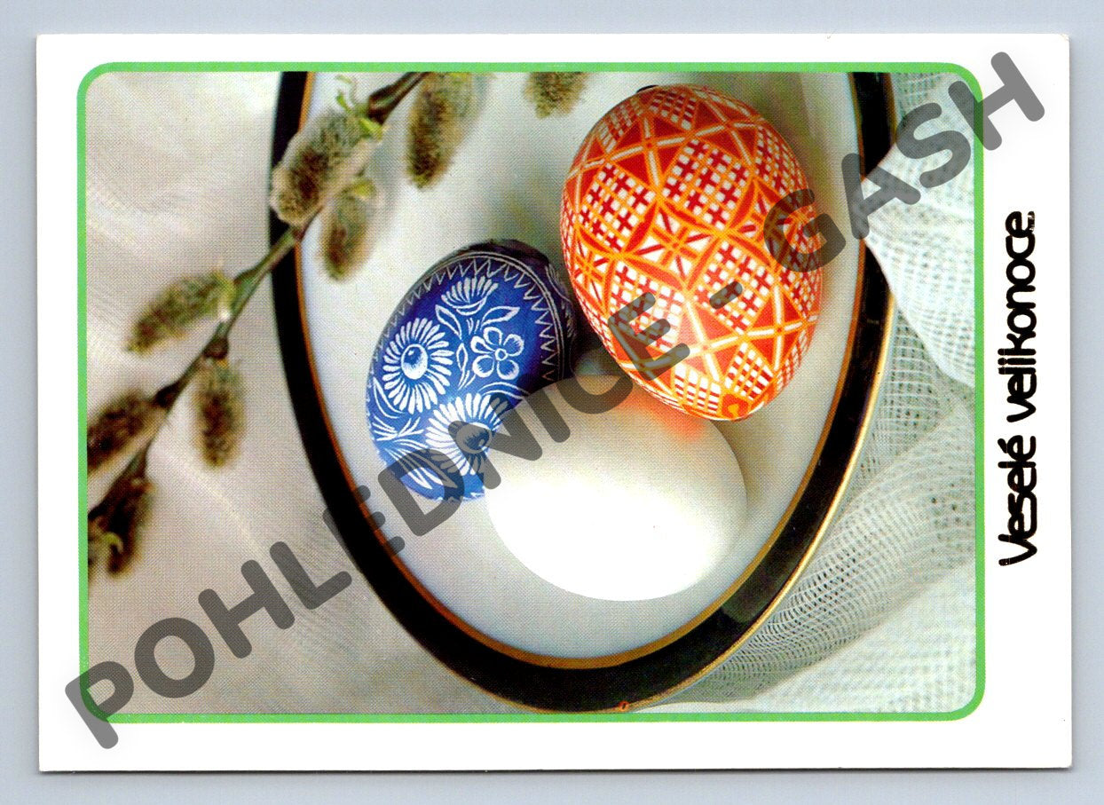 Velikonoční pohlednice s nápisem Veselé Velikonoce . Na lícové straně jsou vyobrazeny tradiční kraslice – jedna modrobílá s květinovými vzory, druhá červenobílá s geometrickým vzorem a jedno bílé vejce, vše na miskách a doplněné kočičkami (větvičky jívy). Pohlednice je neprošlá, bez známky a bez textu, ve velmi dobrém stavu. Vydavatelství Pressfoto Praha, fotograf Milan Misárek, tisk Severografia Děčín. Orientováno na klasickou českou tematiku a folklór. Ideální do sbírky tematických pohlednic či jako dekorace k Velikonocům.