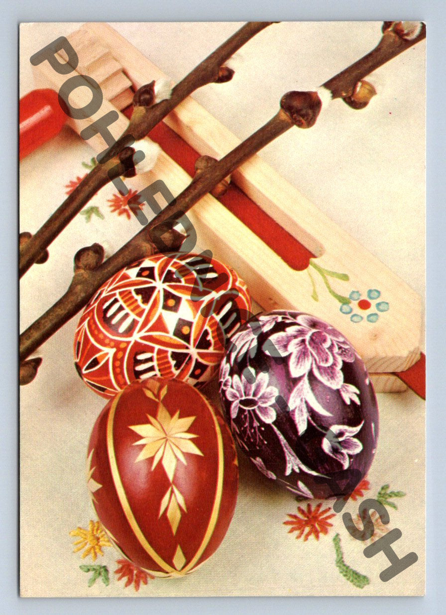 Velikonoční pohlednice z Česka s barevnými kraslicemi a tradičními pomlázkami. Na přední straně jsou tři ručně malované velikonoční kraslice položené na větvičkách kočiček, v pozadí jsou vidět pomlázky a květinový dekor. Pohlednice je ve velmi dobrém stavu, čistá, nepopsaná. Vydavatel PANORAMA, foto K. Líbal, SG Velký Šenov. Odhadované období vydání je po roce 1950. Ideální sběratelský kousek s tématem českých velikonočních tradic.