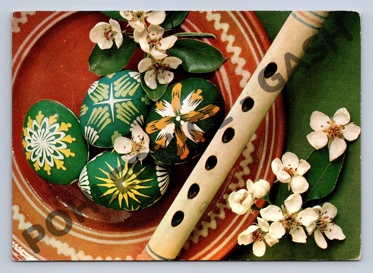 Velikonoční pohlednice z Československa s tradičními motivy kraslic, květin a píšťalky na přední straně. Pohlednice je věnovaná a má známku z období Československa, což ji činí cenným sběratelským exemplářem. Na přední straně najdeme krásně zdobená zelená vejce, tradiční keramickou misku a větvičky rozkvetlých stromů. Zadní strana obsahuje přání Veselé Velikonoce a poštovní známku s hodnotou 50 haléřů. Jedná se o autentický doklad dobové velikonoční tradice vhodný do sbírky historických pohlednic.