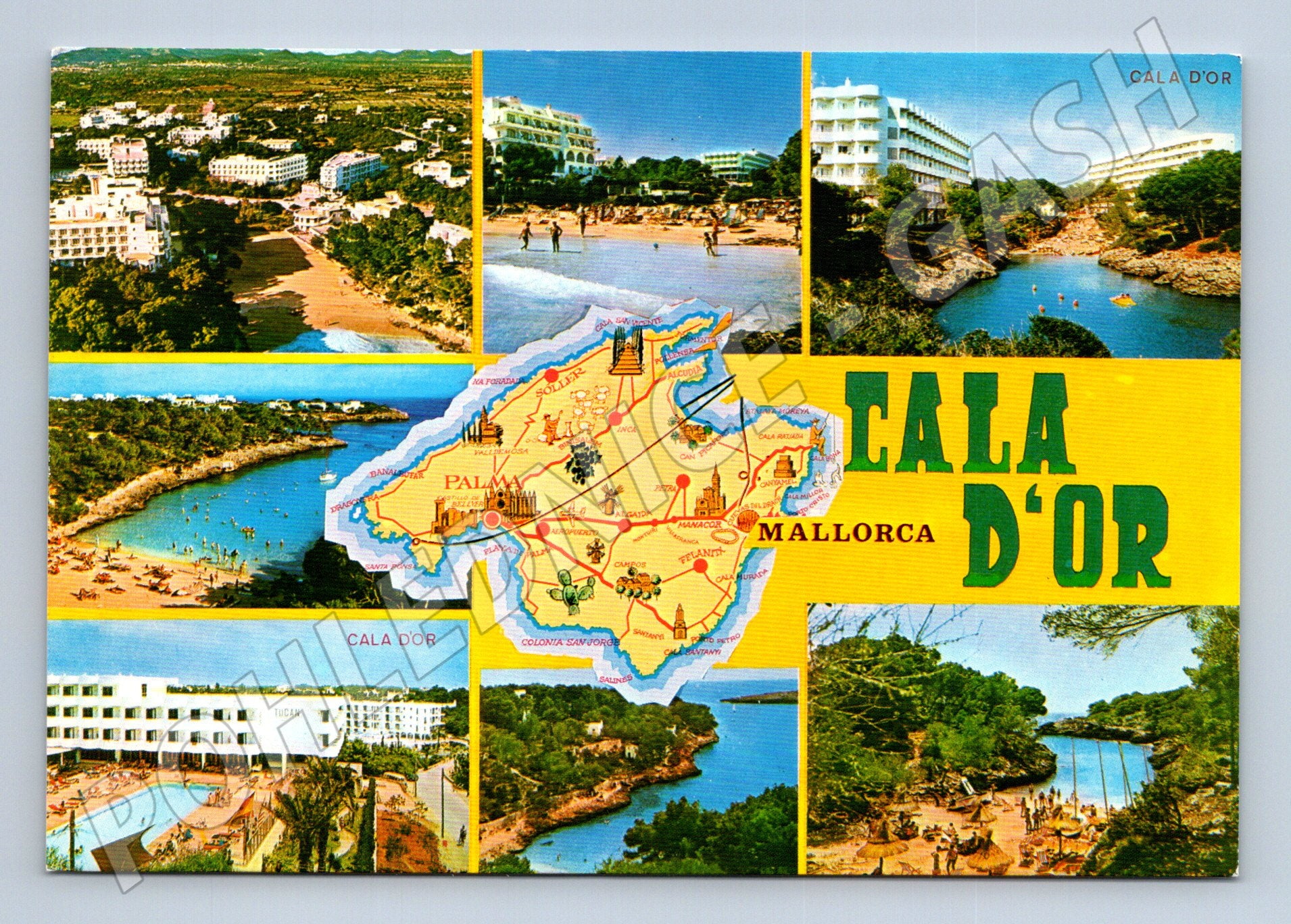 Originální pohlednice z letoviska Cala d Or na Mallorce ve Španělsku. Na přední straně je koláž fotografií zachycující krásné pláže, hotely, bazény i typické zátoky této oblasti. Uprostřed je mapa ostrova Mallorca s vyznačenou polohou Cala d Or. Na zadní straně je osobní vzkaz, španělská známka a razítko se španělským poštovním razítkem, což podtrhuje autentičnost pohledu jako zaslané pohlednice z dovolené. Výborný stav, barevná pohlednice, vhodná pro sběratele pohlednic ze zahraničních destinací nebo jako vzpomínka na dovolenou na Mallorce.