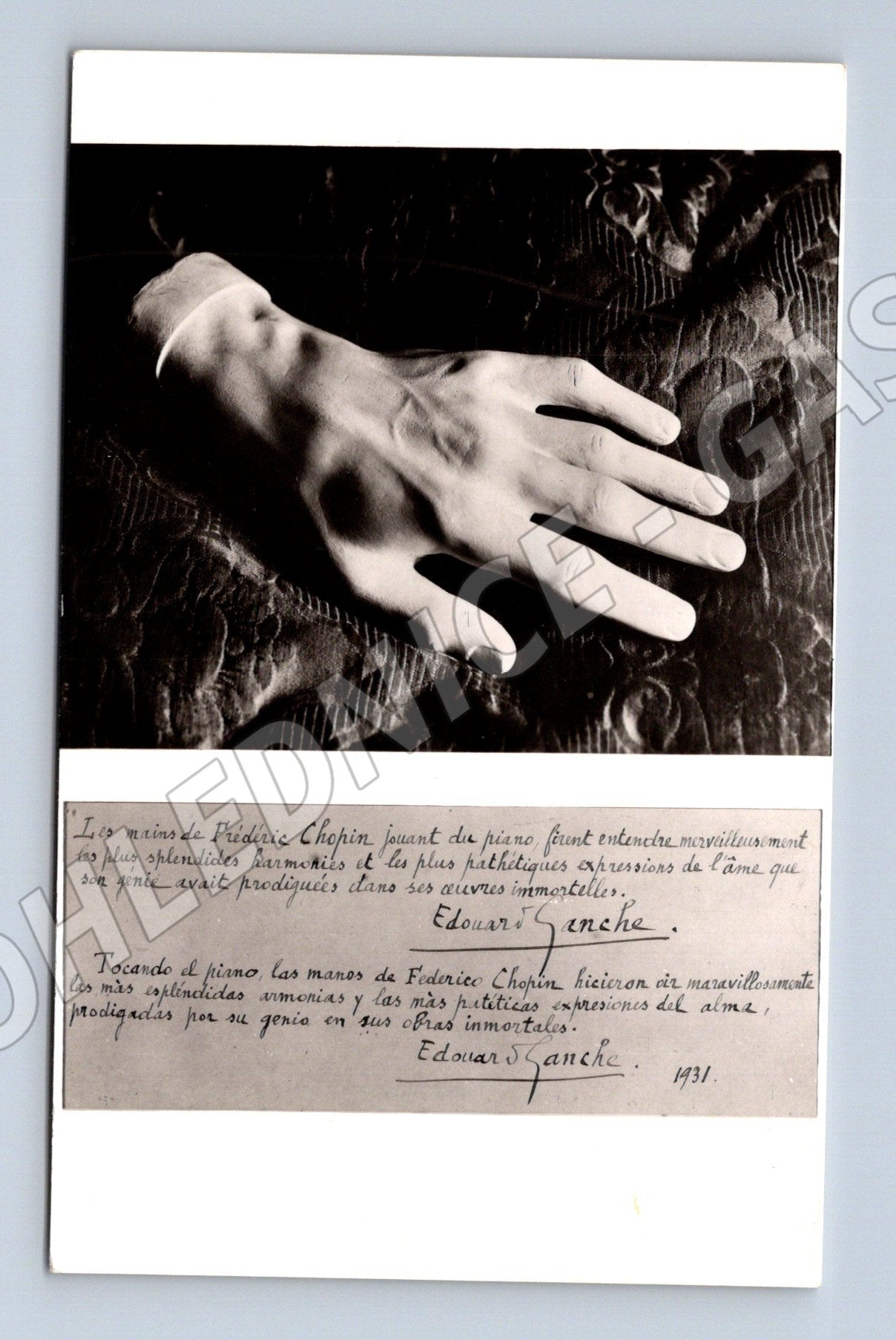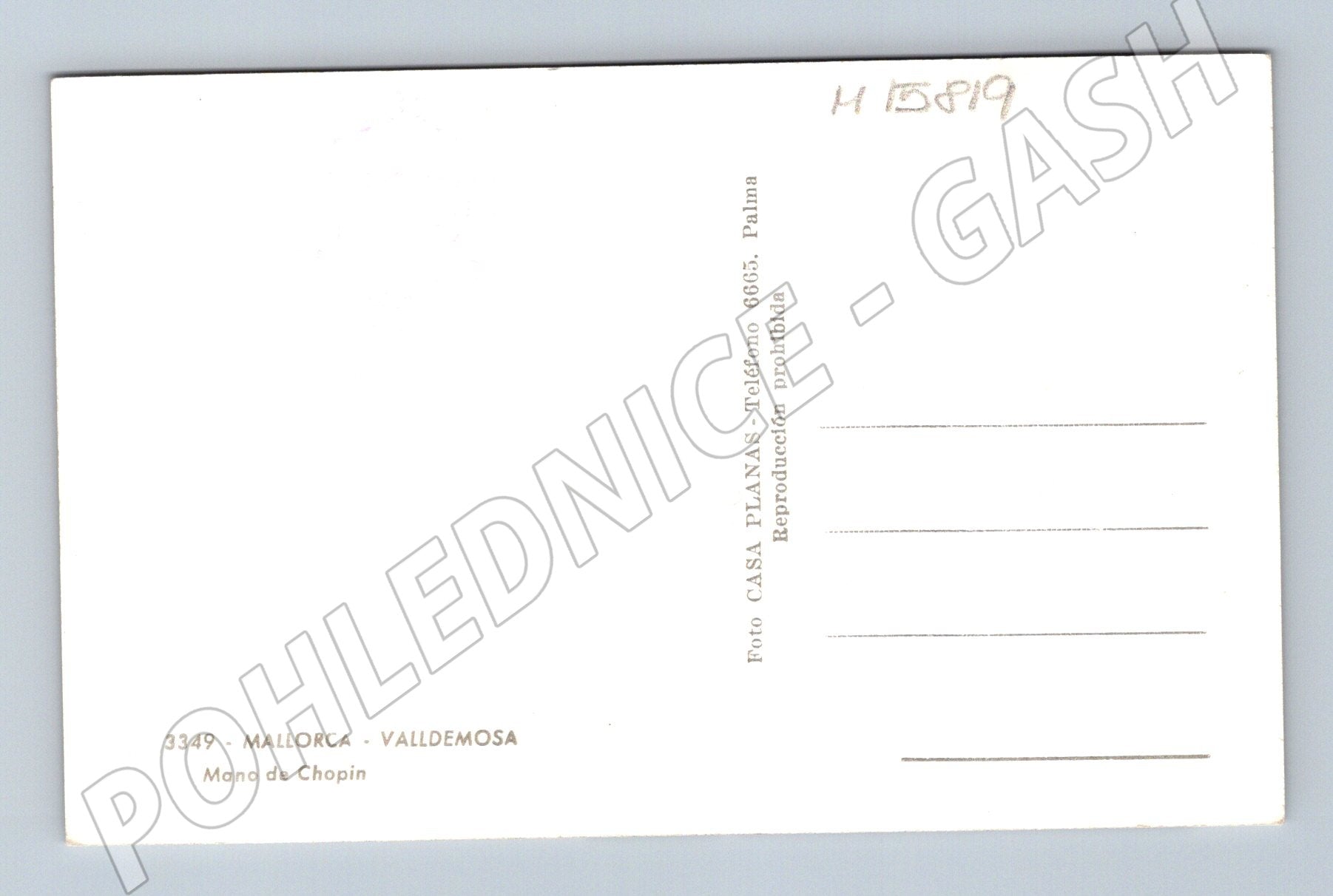 Originální pohlednice zobrazující ruku slavného skladatele Fryderyka Chopina. Pohlednice nese označení 3349 - Mallorca - Valldemosa - Mano de Chopin a byla vydána fotografickým ateliérem Casa Planas. Na přední straně je černobílá fotografie Chopinovy ruky a ručně psaný text v několika jazycích. Na zadní straně je místo pro adresu a poznámku. Pohlednice pochází ze sběratelské edice, je vhodná nejen pro obdivovatele hudby, ale i pro sběratele historických a tematických pohlednic.
