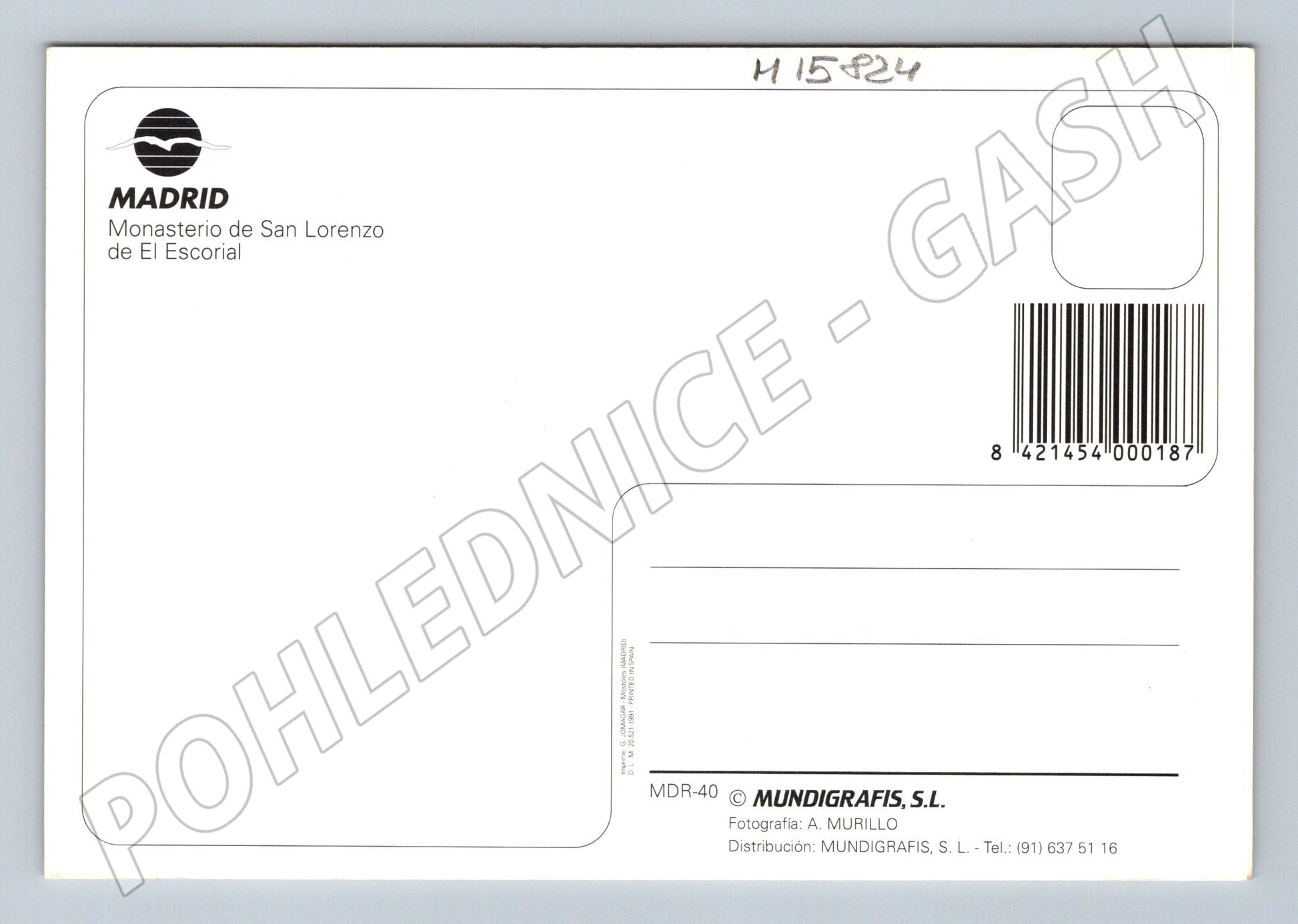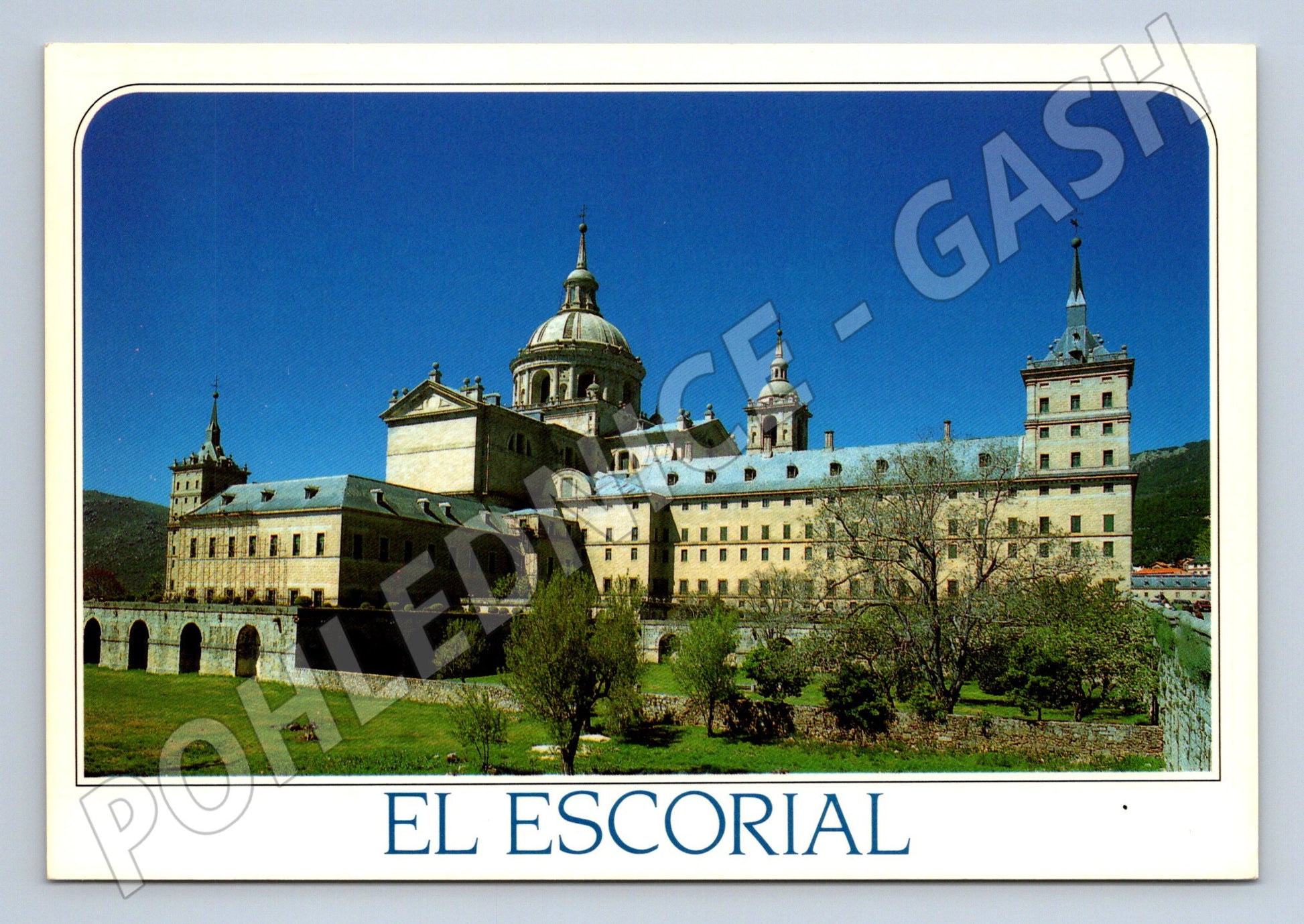 Pohlednice zachycuje slavný královský klášter El Escorial, nacházející se ve městě San Lorenzo de El Escorial nedaleko Madridu. Na pohlednici je výrazně vidět impozantní stavba s rozsáhlými zahradami, jasnou modrou oblohou a charakteristickými věžemi. Monasterio de San Lorenzo de El Escorial je renesanční památka, která sloužila jako královský palác, klášter i pohřebiště španělských králů. Zadní strana pohlednice je nepopsaná, určena k zaslání, a obsahuje popis místa a kontaktní informace vydavatele. Pohlednice je ve velmi dobrém stavu, vhodná pro každého sběratele historických či architektonických motivů ze Španělska.