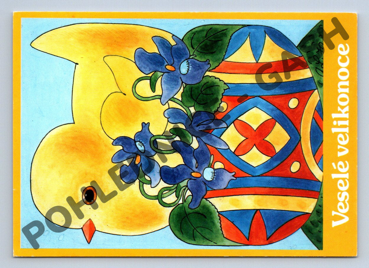 Velikonoční pohlednice s motivem malovaného kuřátka na kraslici doplněného fialkami od výtvarnice Aleny Ladové. Pohlednice je z roku 1970, vydána Galerií Apollo v Pardubicích, tištěná N & B Děčín. Na přední straně je nápis Veselé velikonoce, zadní strana je čistá k osobnímu popsání, bez použití. Krásný příklad české velikonoční tvorby vhodný i do sbírky malířských pohlednic nebo tematických pohlednic k Velikonocům.