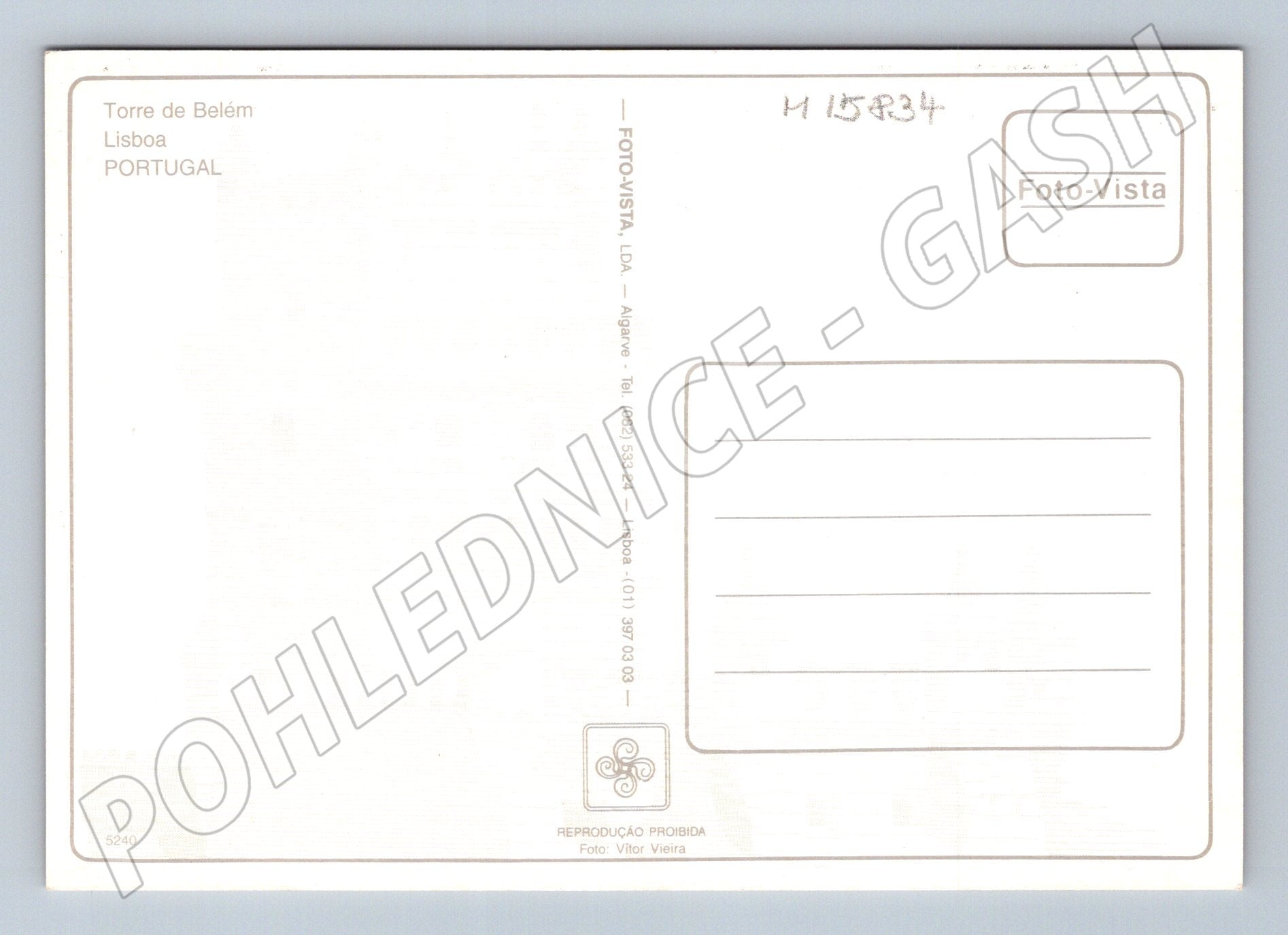 Pohlednice zobrazuje ikonickou Belémskou věž (Torre de Belém) v Lisabonu, Portugalsko. Tato významná historická památka z 16. století byla postavena jako opevněná strážní věž na břehu řeky Tejo a dnes je zapsána na seznamu světového dědictví UNESCO. Pohlednice je zachycena v barevném provedení, z přední strany je vidět věž a přilehlý mostek s turisty, na zadní straně jsou označení místa pro známku i adresu. Ideální pro sběratele či milovníky historických památek i Portugalska. Stav: velmi dobrý, nepopsaná.