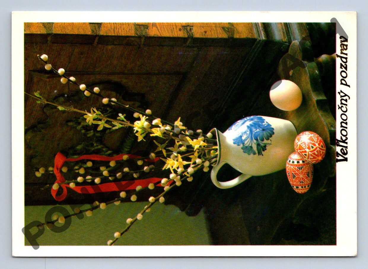 Originální velikonoční pohlednice s motivem tradičních oslav Velikonoc. Na lícové straně je dekorativní zátiší s modrobílou keramickou konvičkou, větvičkami jívy (kočiček) ovázanými červenou stužkou a typicky zdobenými kraslicemi. Pohlednice obsahuje velikonoční pozdrav a byla vytištěna vydavatelstvím Pressfoto Praha. Na zadní straně je ručně psané přání, razítko a známka Československo. Velmi dobrý stav, zajímavý sběratelský kousek vhodný do tematických kolekcí. Rozměr cca 14 x 9 cm.