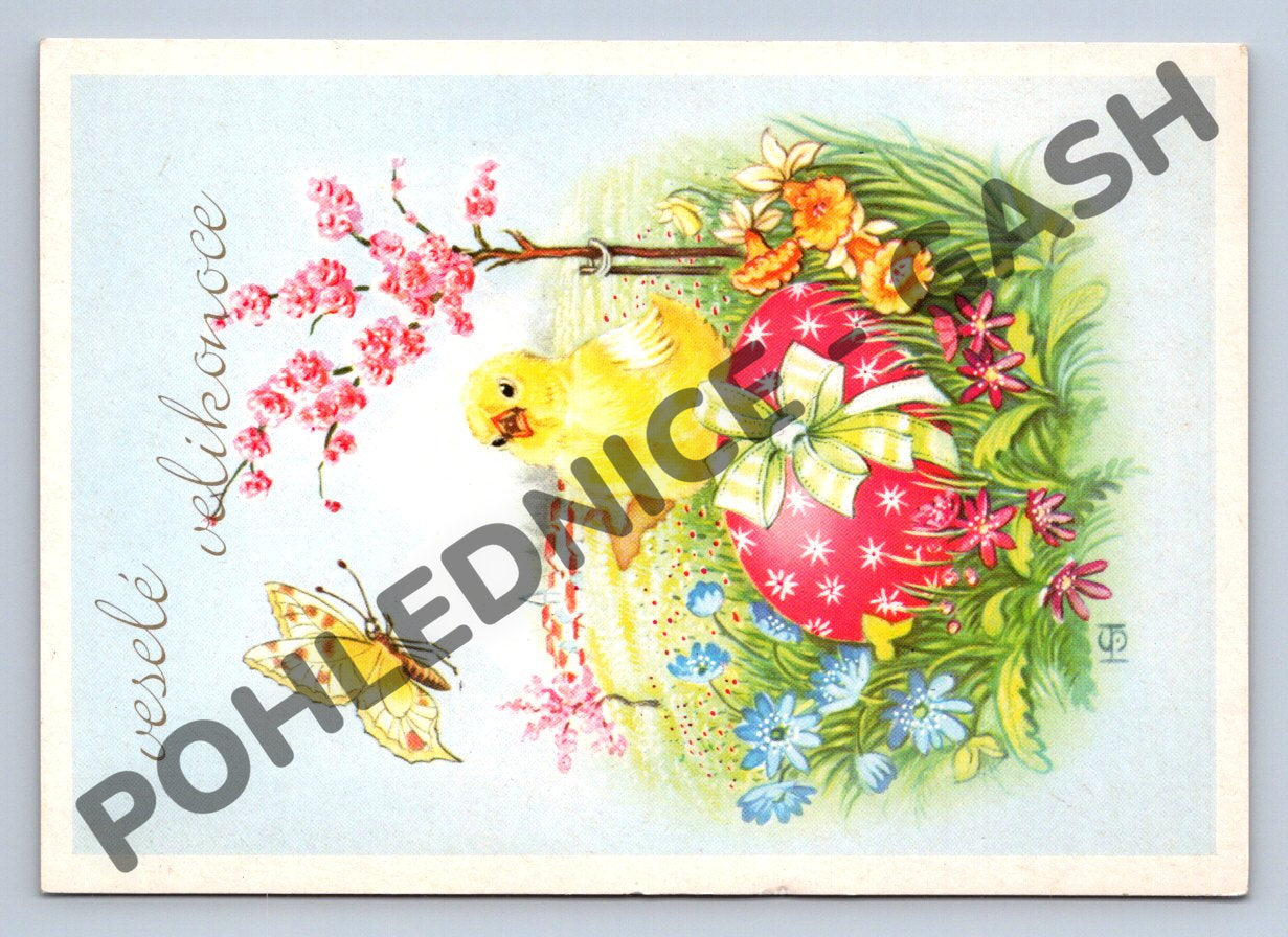 Velikonoční pohlednice s krásným barevným motivem kuřátka u zdobeného vejce, obklopeného jarními květy a rozkvetlou větvičkou. Na pohlednici je také vyobrazen motýl a nápis veselé velikonoce. Pohlednice je ve velmi dobrém stavu, nepopsaná, určena pro sběratelské nebo dekorativní účely. Velikost odpovídá běžnému formátu pohlednic. Velmi pěkný kousek do sbírky velikonočních pohlednic se zvířecím motivem.