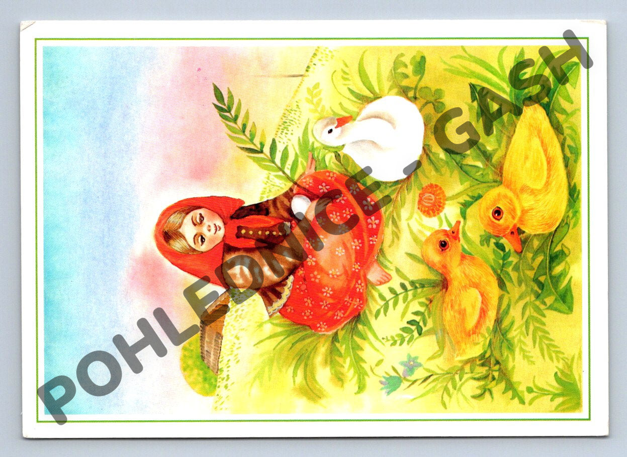 Nabízím pohlednici s krásnou barevnou ilustrací dívky v kroji, sedící na trávě mezi mláďaty kachen, kuřat a králíčkem. Autorkou obrázku je V. Klimtová a vydavatelem GRAFIATISK. Pohlednice je prošlá poštou v roce 1992, opatřena známkou a razítkem z Prahy. Zadní strana je popsaná, adresována do Prahy. Perfektní pro sběratele pohlednic s folklórní nebo dětskou tematikou, milovníky ilustrací nebo jako vzpomínka na českou etnografii.