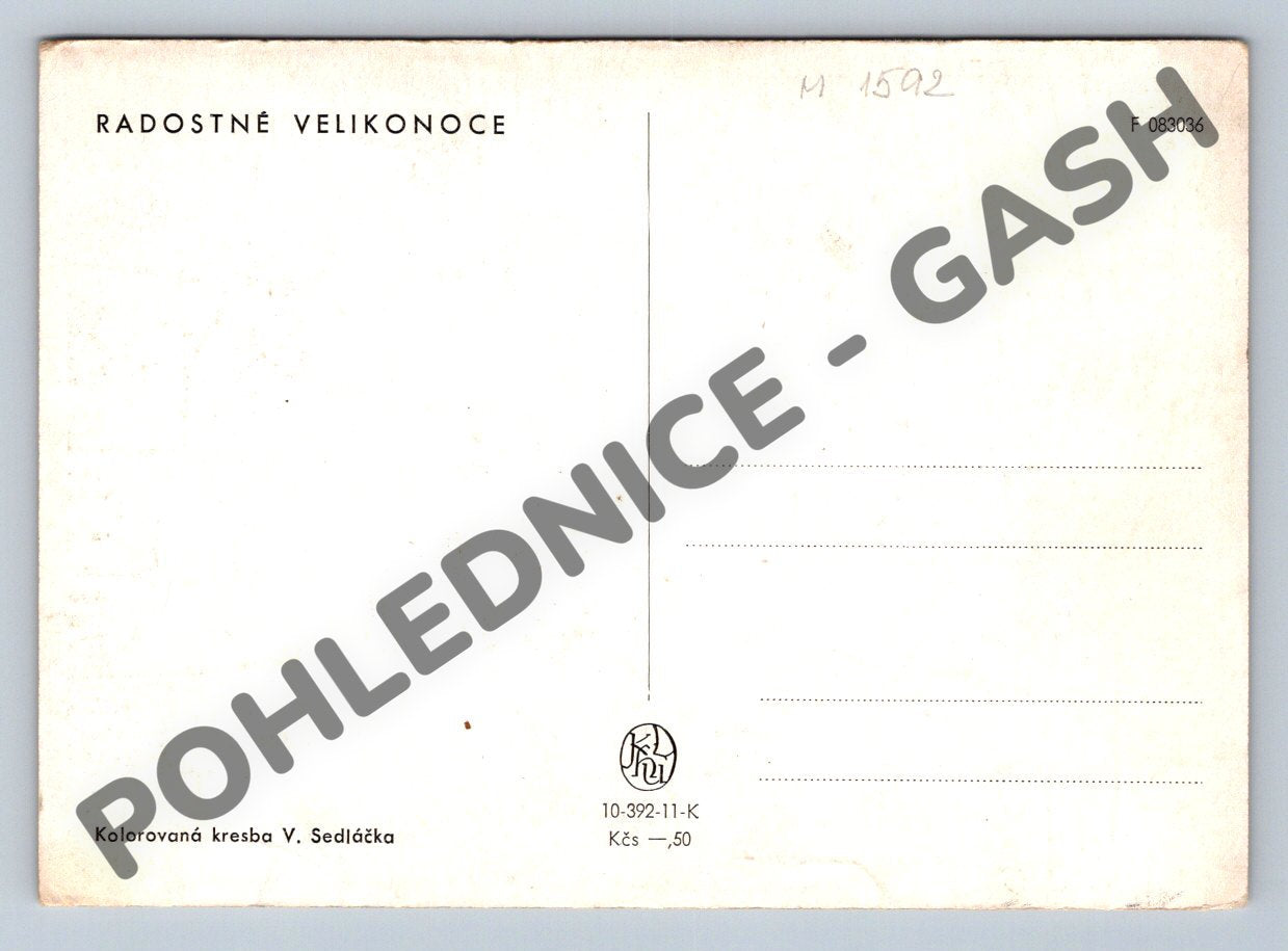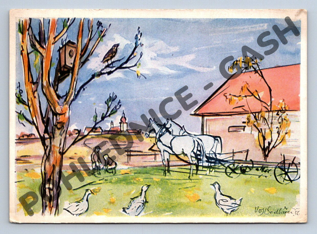 Velikonoční pohlednice s kolorovanou kresbou od V. Sedláčka, která znázorňuje jarní venkovskou scenérii. Na obrázku jsou zachyceni dva koně zapřažení do pluhu, děti na poli, husy na louce, strom s ptačí budkou a v pozadí vesnické stavení s kostelem i stodola. Pohlednice má na zadní straně přání Radostné Velikonoce . Vhodné pro sběratele či jako dekorace. Formát klasické pohlednice, nevypisovaná, velmi pěkný stav.