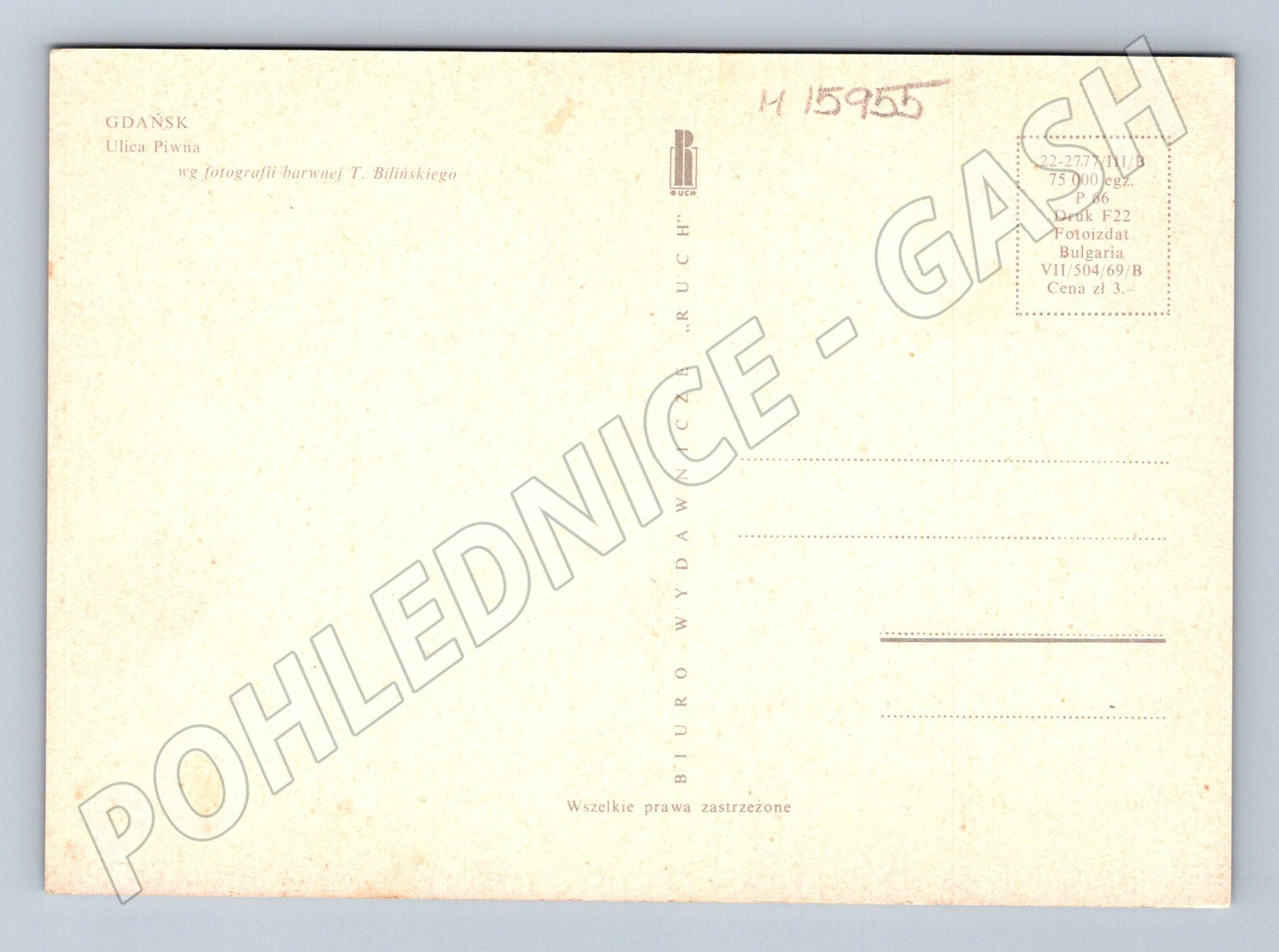 Originální pohlednice zobrazující ulici Piwna v Gdaňsku, Polsko. Fotografie pochází z barevné série podle T. Bilińského a byla vydána nakladatelstvím Ruch. Na pohlednici jsou zachyceny historické domy, dobové automobily a atmosféra velkoměsta 60. až 70. let 20. století. Pohlednice nebyla využita (neprošla poštou), je určena k dalšímu sběratelskému využití nebo jako krásná dekorace. Ideální přírůstek do sbírky pohlednic z Polska, případně sbírky dopravních nebo městských motivů. Stav viz foto, formát klasické pohlednice.