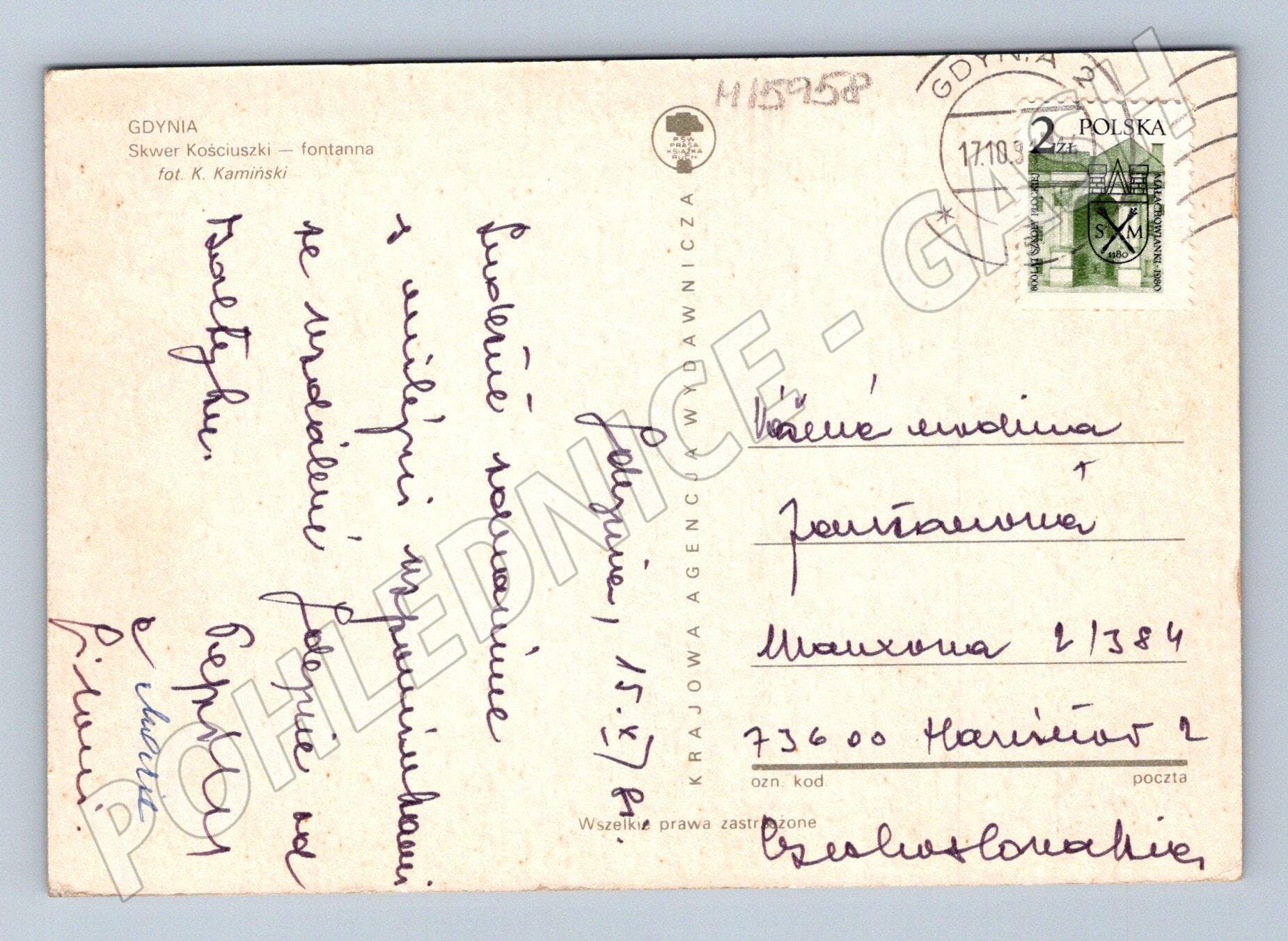 Nabízím originální pohlednici ze 70. let zobrazující fontánu na náměstí Skwer Kościuszki ve městě Gdynia v Polsku. Na pohlednici je barevná fotografie fontány s dětmi a květinovou výsadbou v popředí. Zadní strana je popsána, s razítkem i polskou známkou. Vhodné pro sběratele tematických pohlednic, zvláště zájemce o polská města, architekturu či památky. Stav odpovídá stáří, viz foto. Fotografie: K. Kamiński. Unikátní doklad doby i místa.