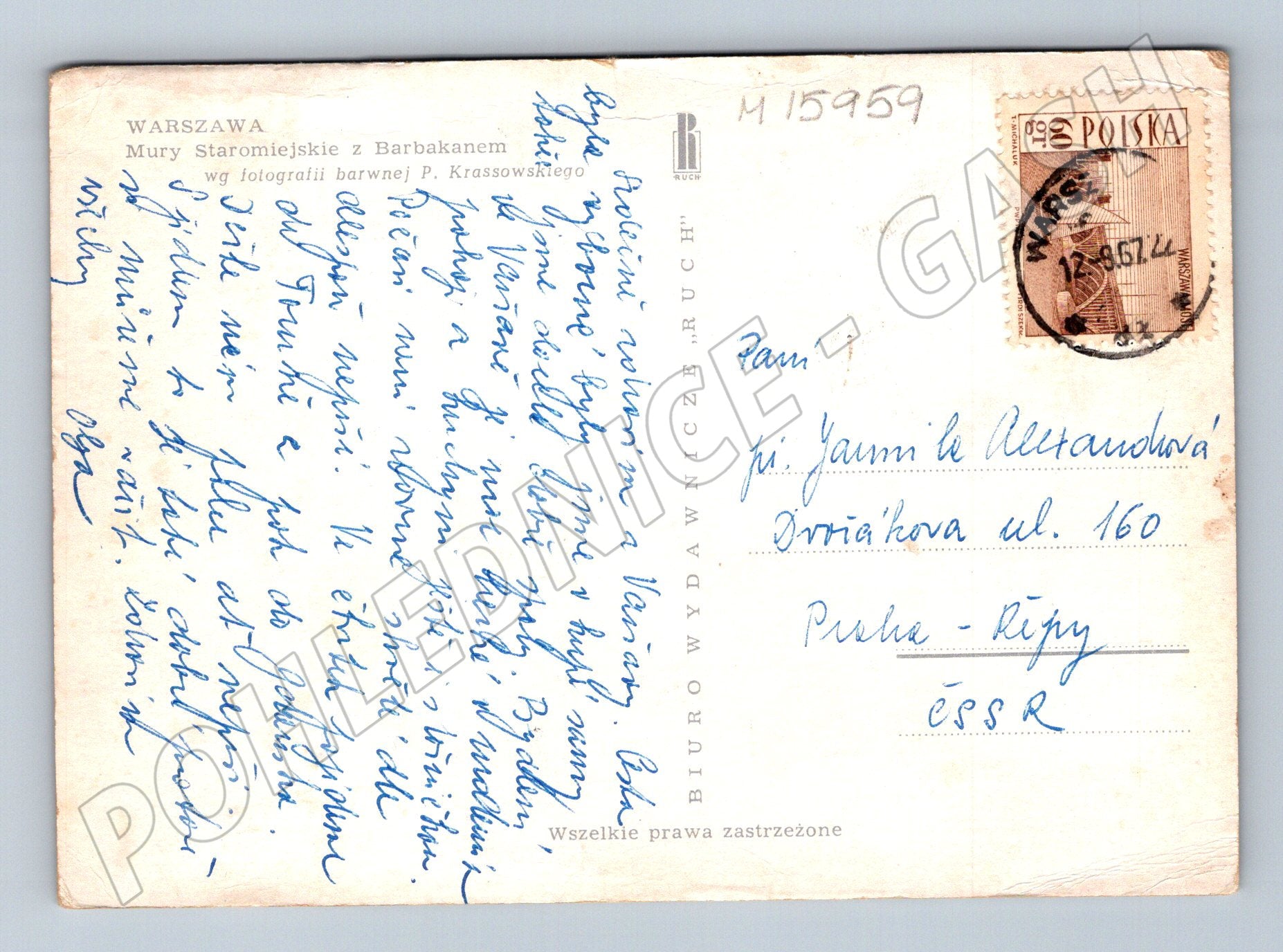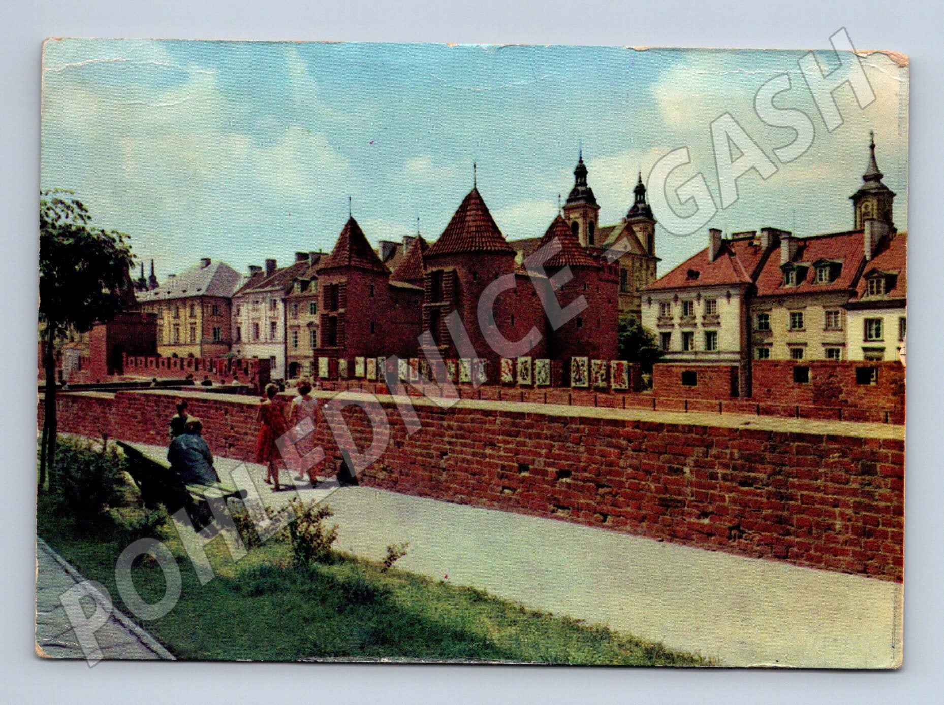 Nabízím starou pohlednici z Polska, konkrétně z Varšavy, s motivem Staroměstských hradeb a barbakanu (Mury Staromiejskie z Barbakanem). Pohlednice je prošlá poštou, včetně známky a ručně psaného textu. Na přední straně se nachází barevná fotografie varšavských hradeb s přilehlou parkovou stezkou a lidmi, v pozadí pak historické budovy Starého Města. Vhodné jako sběratelský kousek, dokumentující atmosféru poválečné Varšavy a architekturu. Celkový stav je odpovídající stáří – mírně opotřebované rohy. Výborný doplněk sbírky zahraničních pohlednic nebo polské tematiky.