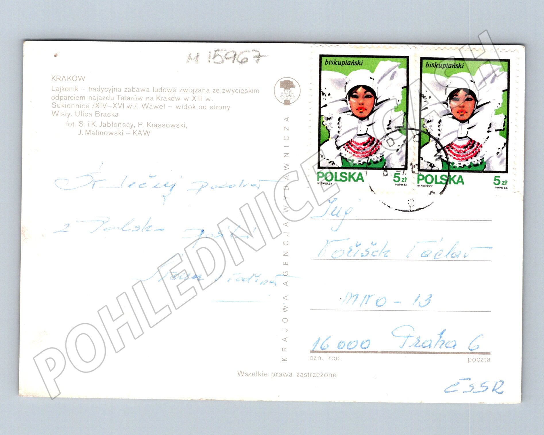 Pohlednice Krakow - víceobrázková kolorovaná pohlednice zobrazující významné památky města Krakov v Polsku. Na přední straně jsou vyobrazeny pohledy na náměstí Rynek Glowny s historickými budovami Sukiennice, zámek Wawel, historickou zástavbu města a tradiční průvod s lajkonikem. Zadní strana obsahuje text v polštině a dvě poštovní známky Polska s motivem regionálního kroje (biskupianski). Pohlednice je prošlá poštou, nese ručně psaný vzkaz a adresu do tehdejšího Československa. Skvělý sběratelský kus nebo dobový suvenýr z Polska.