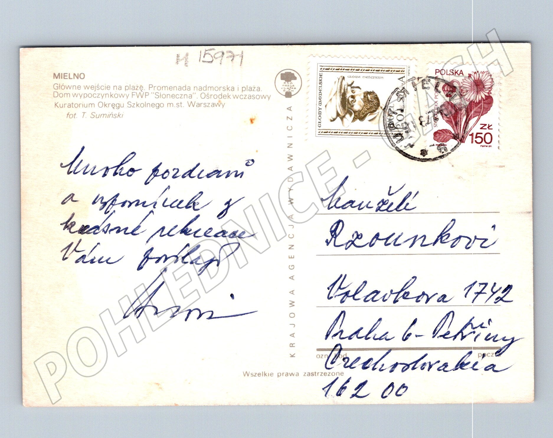 Originální pohlednice z polského letoviska Mielno, zaslaná v 70. či 80. letech 20. století. Přední stranu pohlednice zdobí čtyři barevné fotografie představující hlavní promenádu, pláž a rekreační objekty u Baltského moře. Zadní strana obsahuje ručně psaný pozdrav, polskou známku a razítko. Skvělý sběratelský kousek pro milovníky retro pohlednic a přímořských destinací. Pohlednice nese známky svého stáří a byla odeslána do Československa.