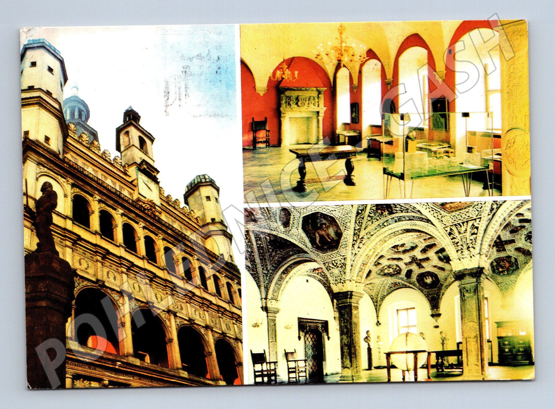 Pohlednice z Polska, konkrétně z města Poznaň, zobrazuje renesanční radnici ze 16. století, dnes sídlo Muzea historie města Poznaň. Na přední straně pohlednice jsou barevné fotografie fasády budovy a interiérů, včetně reprezentačních sálů s bohatou výzdobou. Zadní strana obsahuje originální dobový zápis s poštovní známkou POLSKA a odesláním do tehdejšího Československa. Jedná se o sběratelsky atraktivní pohlednici vhodnou do tematické kolekce zaměřené na polskou architekturu nebo města. Stav pohlednice odpovídá běžnému oběhu, text je psaný ručně.