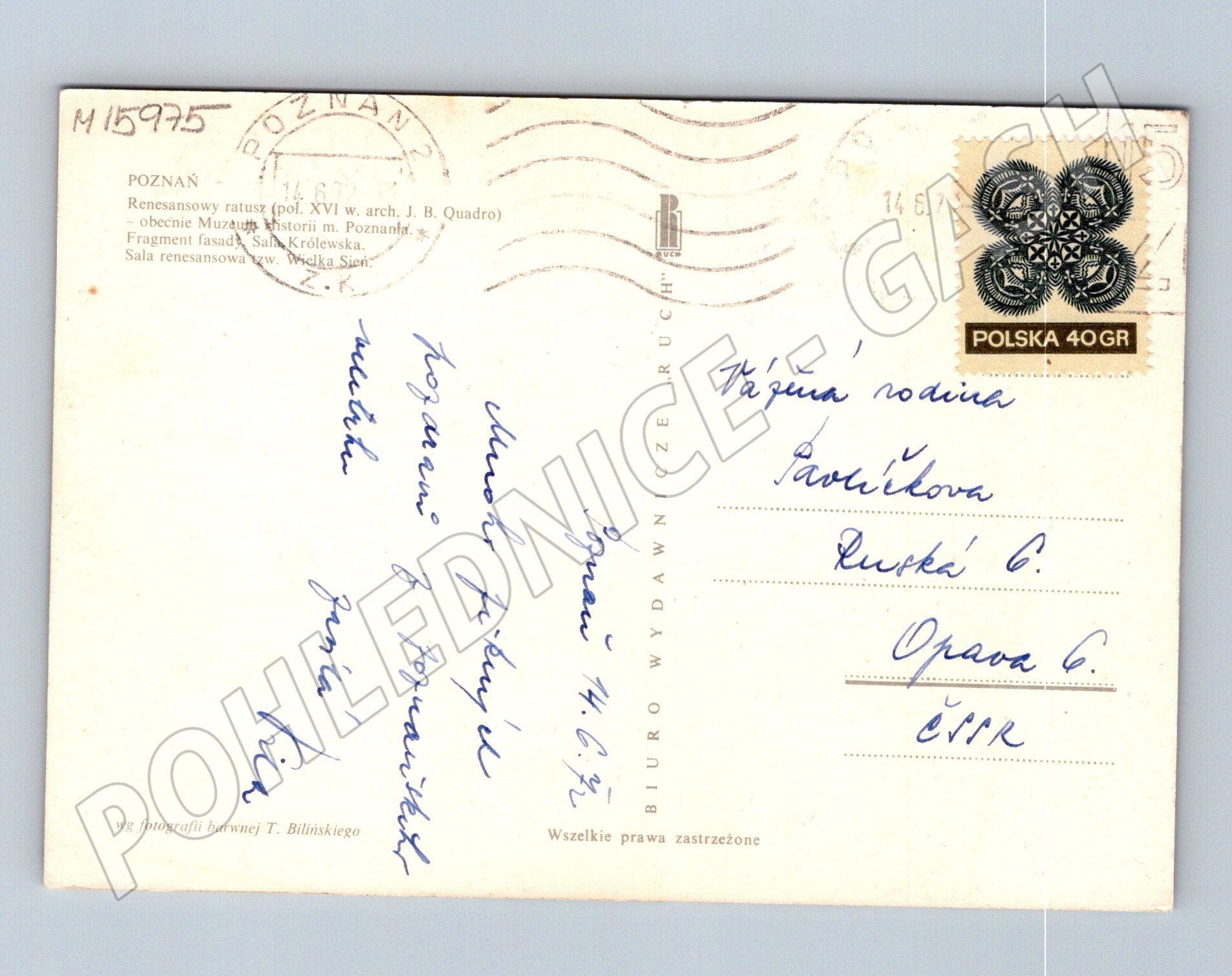 Poznaň – renesanční radnice, Polsko, zaslaná pohlednice s textem