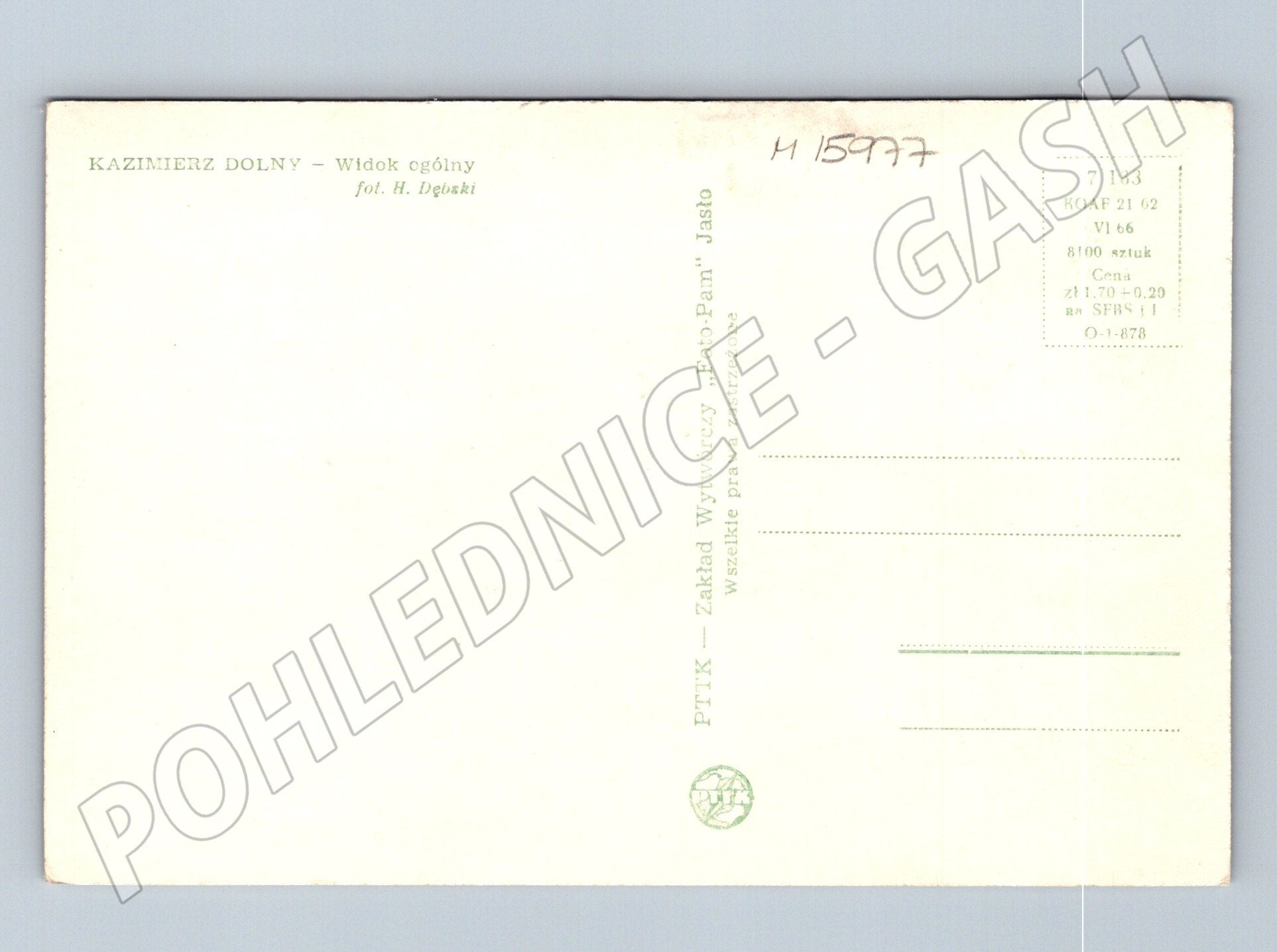 Originální černobílá pohlednice s celkovým pohledem na historické město Kazimierz Dolny v Polsku. Na fotografii od H. Dębakiho je dominantou zřícenina hradu na kopci a kostel v popředí, obklopený starými městskými domy. Listy stromů v horní části rámují pohled na město. Jedná se o typickou sběratelskou pohlednici z 60. let 20. století, vydanou podnikem Zakład Wytwórczy Fot-Pam Jasło (PTTK). Pohlednice nebyla použita, rub je čistý, dole označení a detaily vydavatele, tisk č. 7133, série ROAF 2162, náklad 8100 ks. Skvělý přírůstek do sbírky pohlednic polských měst a architektury.