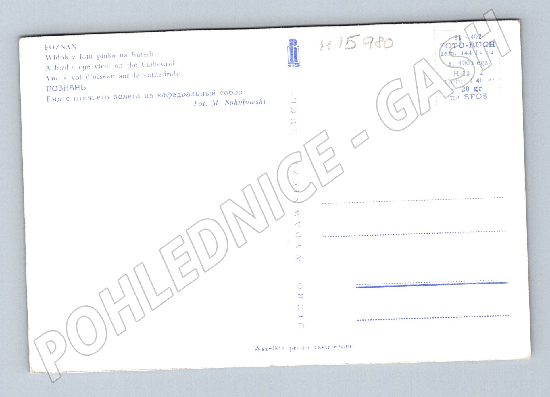 Originální černobílá pohlednice zobrazující katedrálu v Poznani z ptačí perspektivy (widok z lotu ptaka na Katedrę). Pohlednice nese popis ve více jazycích, autorem fotografie je M. Sokołowski. Na zadní straně jsou vytištěny informace o vydavateli FOTO-RUCH. Pohlednice byla vydána v Polsku a zachycuje významnou architektonickou památku města Poznaň. Velmi dobrý stav, bez popsání. Originální historický dokument polské architektury vhodný pro sběratele.