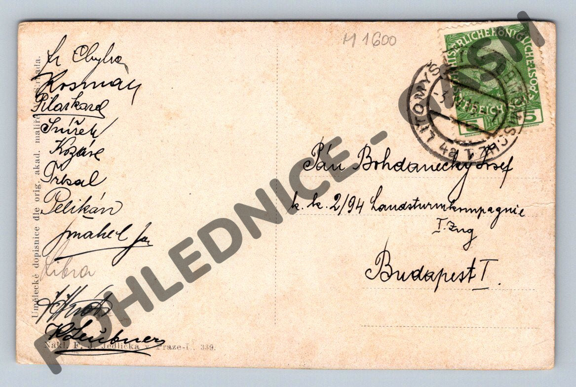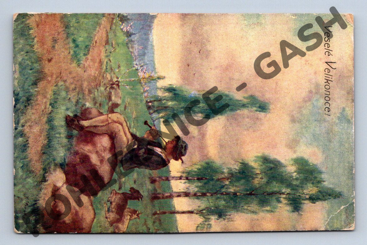 Velikonoční pohlednice s motivem muže pasoucího ovce na louce, malovaný ve stylu počátku 20. století. Na pohlednici je umístěn nápis Veselé Velikonoce! a je zde jemně barevné provedení. Zadní strana je opatřena ručně psaným textem, adresována do Budapešti, s razítkem a známkou Rakousko-Uherska. Tento sběratelský kousek je vhodný pro milovníky starých pohlednic i tematických velikonočních námětů. Stav viz foto – patrné stopy používání, rohy mírně ohnuté.