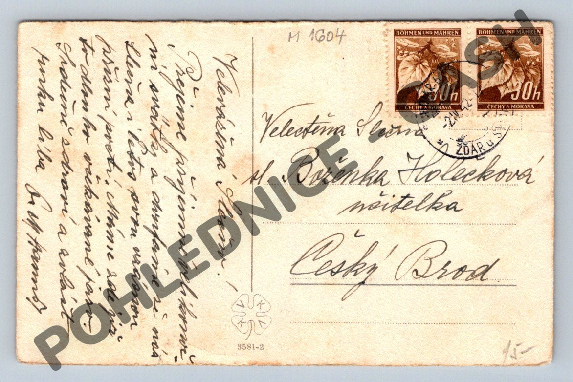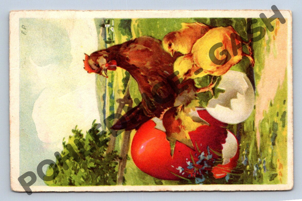 Originální stará pohlednice s motivem slepice a dvou kuřátek u rozbitého vajíčka, v malovaném stylu. Na pozadí se nachází venkovská krajina. Pohlednice byla odeslána – na zadní straně jsou známky z období Protektorátu Čechy a Morava, rukopisná adresa a přání. Celkový stav pohlednice odpovídá stáří, rohy jsou mírně opotřebované, barvy zůstávají pěkně syté. Zajímavý sběratelský kus s tématem domácích zvířat a venkova. Vhodné pro sběratele pohlednic, milovníky malovaných zvířecích motivů nebo tematických velikonočních přání.