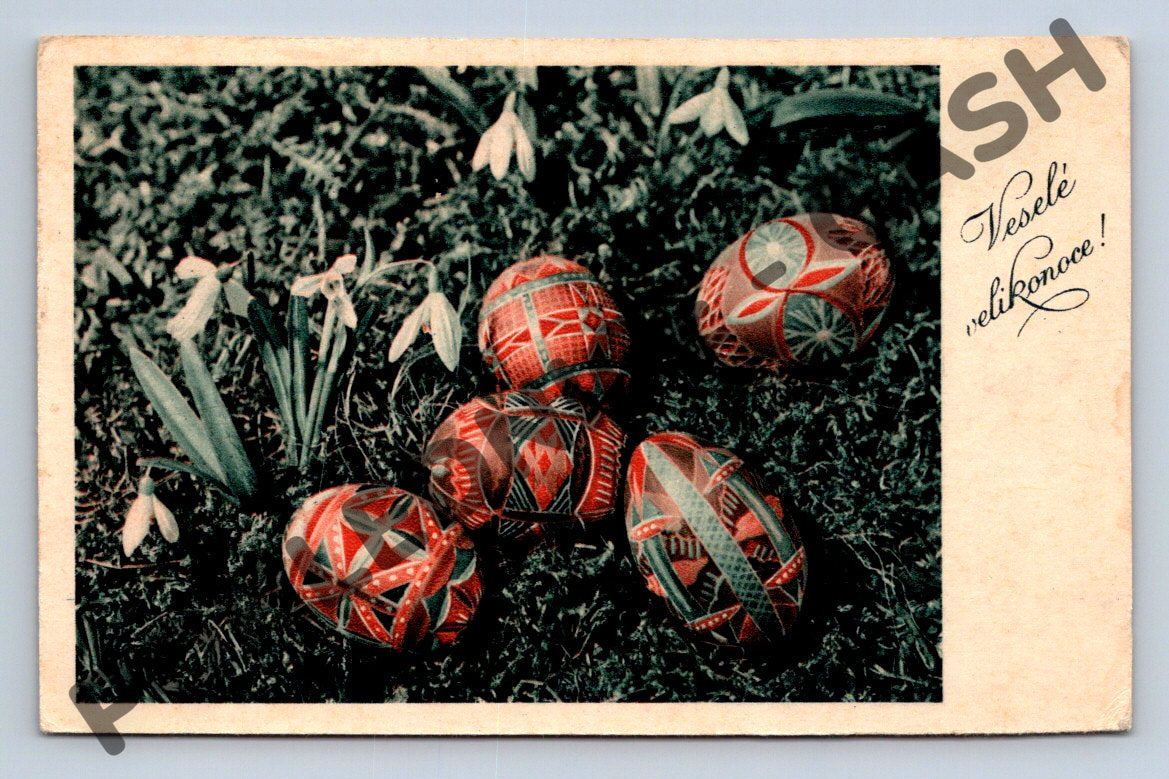Nabízím originální velikonoční pohlednici z období první poloviny 20. století. Na přední straně jsou vyobrazeny tradiční zdobené kraslice položené v trávě mezi květy bledulí, s nápisem Veselé Velikonoce! Pohlednice má krásný barevný tisk, je prošlá poštou s čitelným razítkem, opatřena známkou Československo v hodnotě 1,50 Kčs s portrétem. Zadní strana obsahuje ručně psané věnování adresované panu Josefu Šťastnému do Týniště nad Orlicí. Stav pohlednice odpovídá stáří, místy drobné známky opotřebení. Ideální sběratelský kus s dobovou atmosférou a velikonočním motivem.