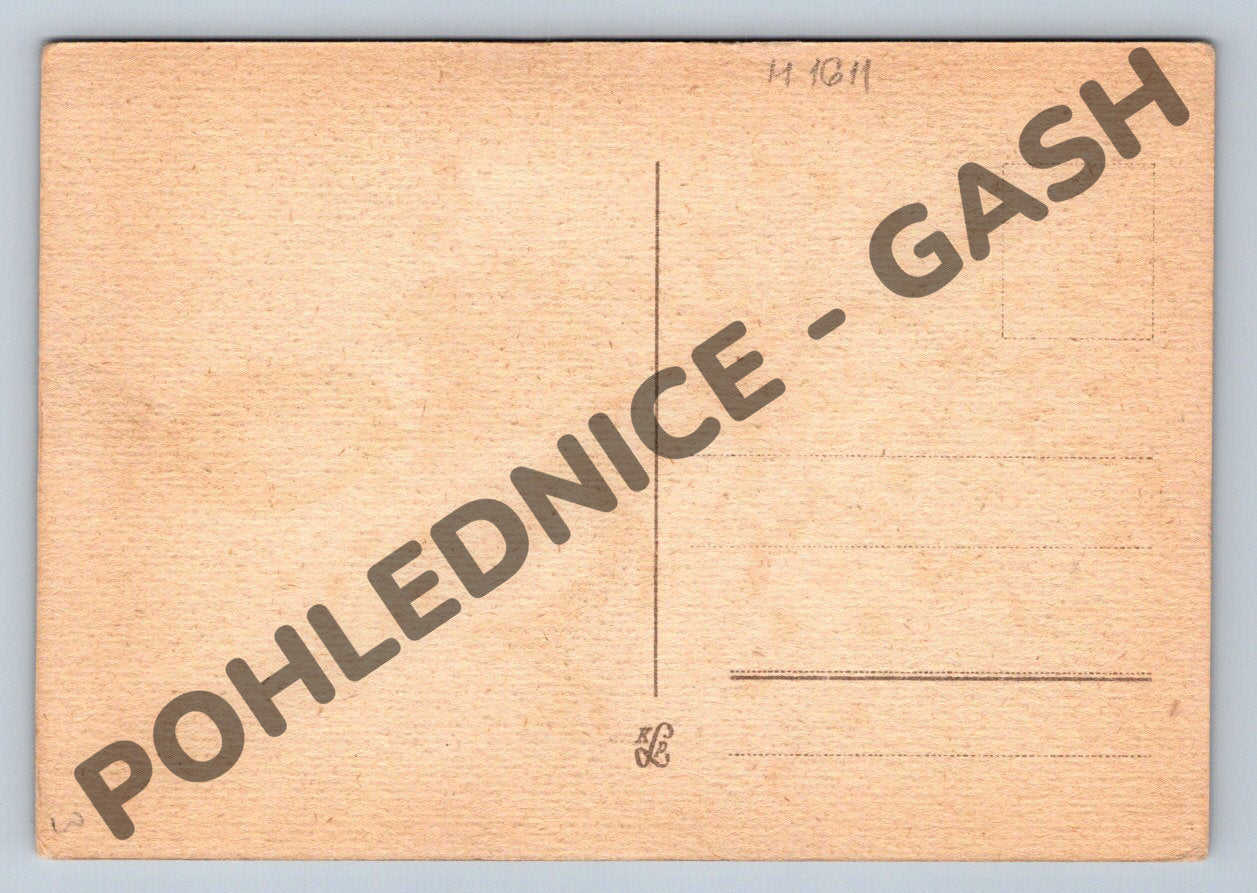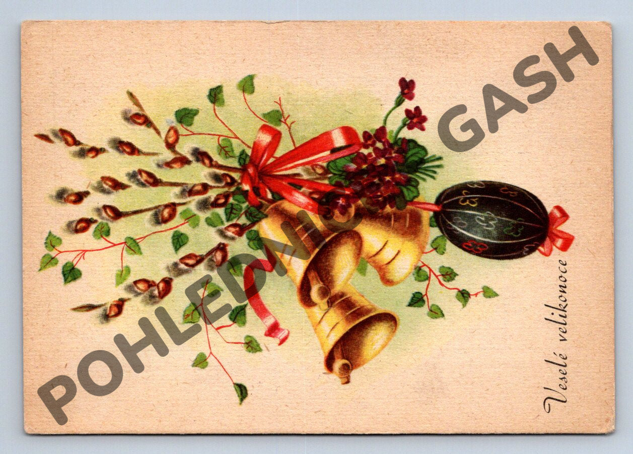 Starobylá velikonoční pohlednice z období do roku 1950. Na přední straně je barevná ilustrace se symboly Velikonoc: pomlázka, velikonoční vejce a zlaté zvony, vše v krásném vintage stylu doplněno květy, listy a červenou stuhou. Nápis Veselé velikonoce je elegantně umístěn na boku. Pohlednice je nepopsaná a zachovalá, s drobnými známkami stáří, které dodávají předmětu autentičnost. Skvělý sběratelský kousek i krásný příklad velikonočních pohlednic z první poloviny 20. století.