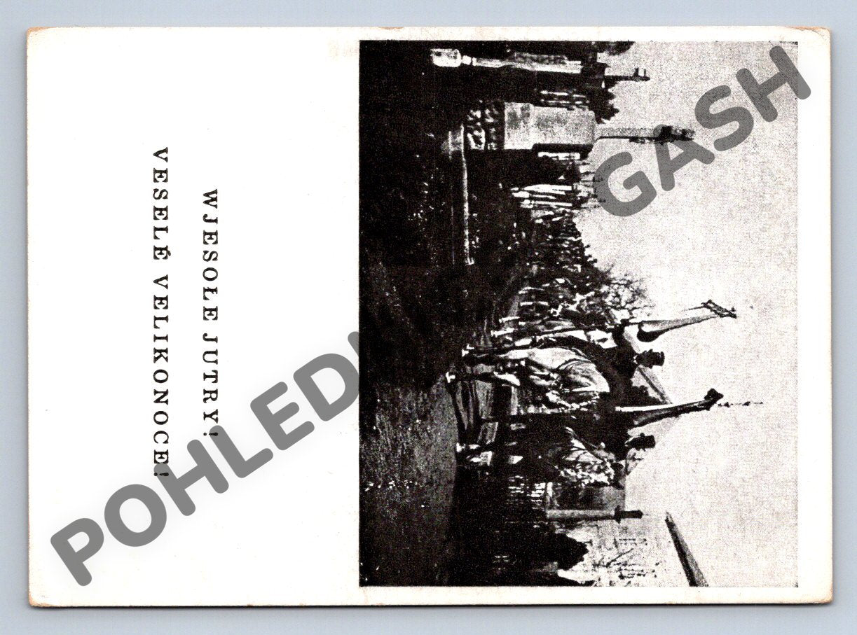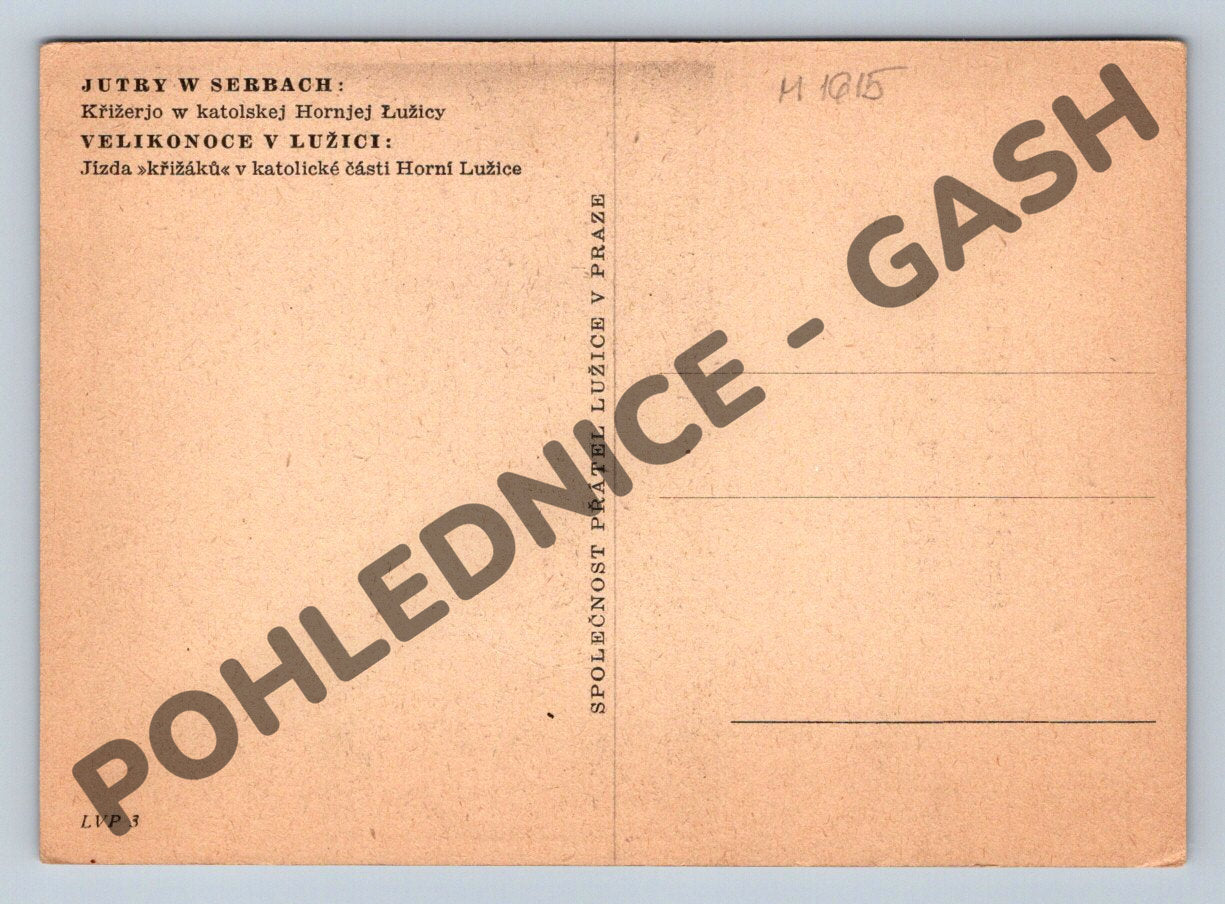 Originální stará pohlednice zobrazující tradiční velikonoční jízdu křižáků v katolické části Horní Lužice. Text na pohlednici je v češtině i hornolužické srbštině. Pohlednice přeje veselé Velikonoce (VJESELÉ VELIKONOCE / WJESOŁE JUTRY!). Vydáno Společností přátel Lužice v Praze. Velmi zajímavý etnografický motiv a historický dokument lidových tradic Lužických Srbů. Pohlednice není popsaná, zadní strana zachovalá, vhodná do sbírky. Odhadem vydání první polovina 20. století.